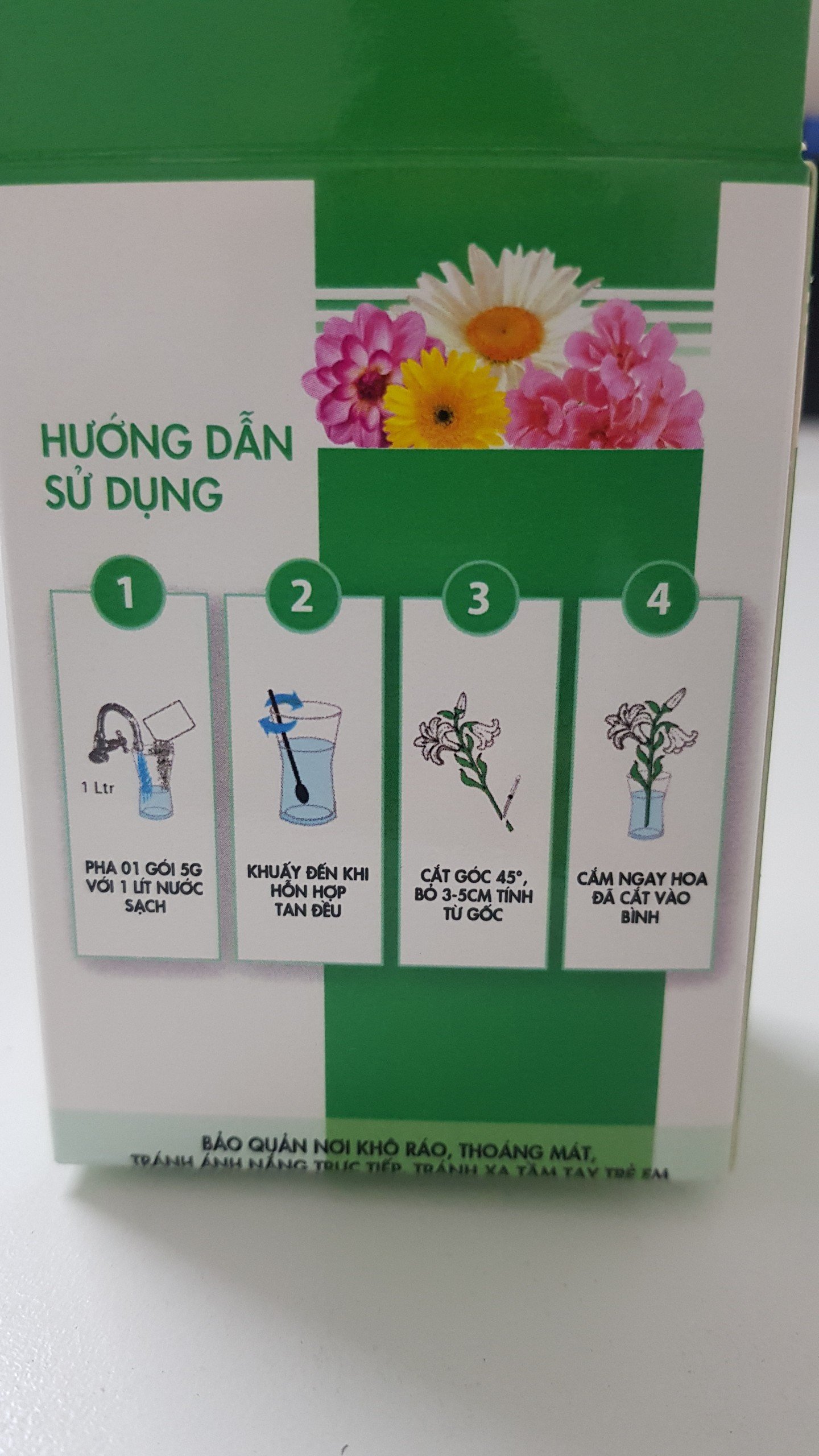 Chất dưỡng hoa 5G nhập khẩu Hà Lan. Giúp hoa tươi lâu, bông nở to đẹp, dung dịch trong không có mùi hôi. Hướng dẫn sử dụng: Hòa tan 1 gói dưỡng hoa 5G với 1L nước sử dụng cắm hoa.