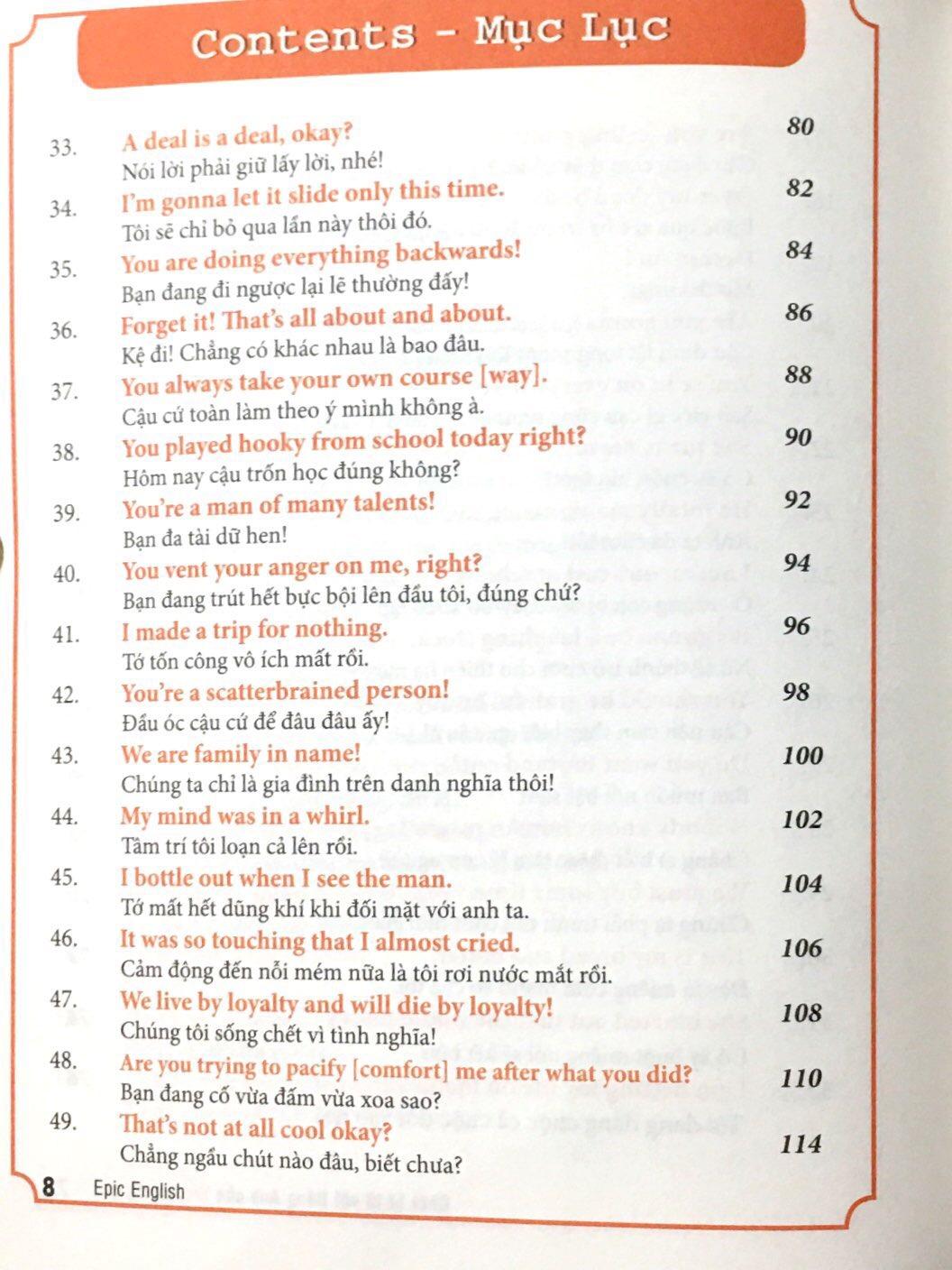 Sử dụng tiếng Anh đẳng cấp không chỉ là giao tiếp lưu loát với người nước ngoài, hay viết được một bài luận mang tính học thuật vô cùng cao siêu. Đối với tôi, đẳng cấp của việc sử dụng tiếng Anh còn là việc có thể nói ra những câu rất “bình dân” mà người bản xứ hay dùng. Phải đấy! Những câu tuy rất “bình dân” đối với người bản xứ, nhưng chúng ta dù học tiếng Anh cả chục năm trời cũng chưa chắc biết được, chẳng hạn như “Bạn chỉ được cái võ mồm” (You’re bold in your words only), “Tôi vẫn còn phong độ chán” (I’ve still got it), “Xin lỗi thôi thì xong chắc” (Sorry is not going to cut it), “Tình yêu có mài ra ăn được đâu, chín chắn lên đi” (Love doesn’t feed you, grow up)… Tác giả chia sẻ trên báo Interview365 của Hàn: “Học thuộc những câu nói thường ngày của người bản xứ mới vận dụng được tiếng Anh trong mọi tình huống, nhờ đó rút ngắn con đường học tập”.