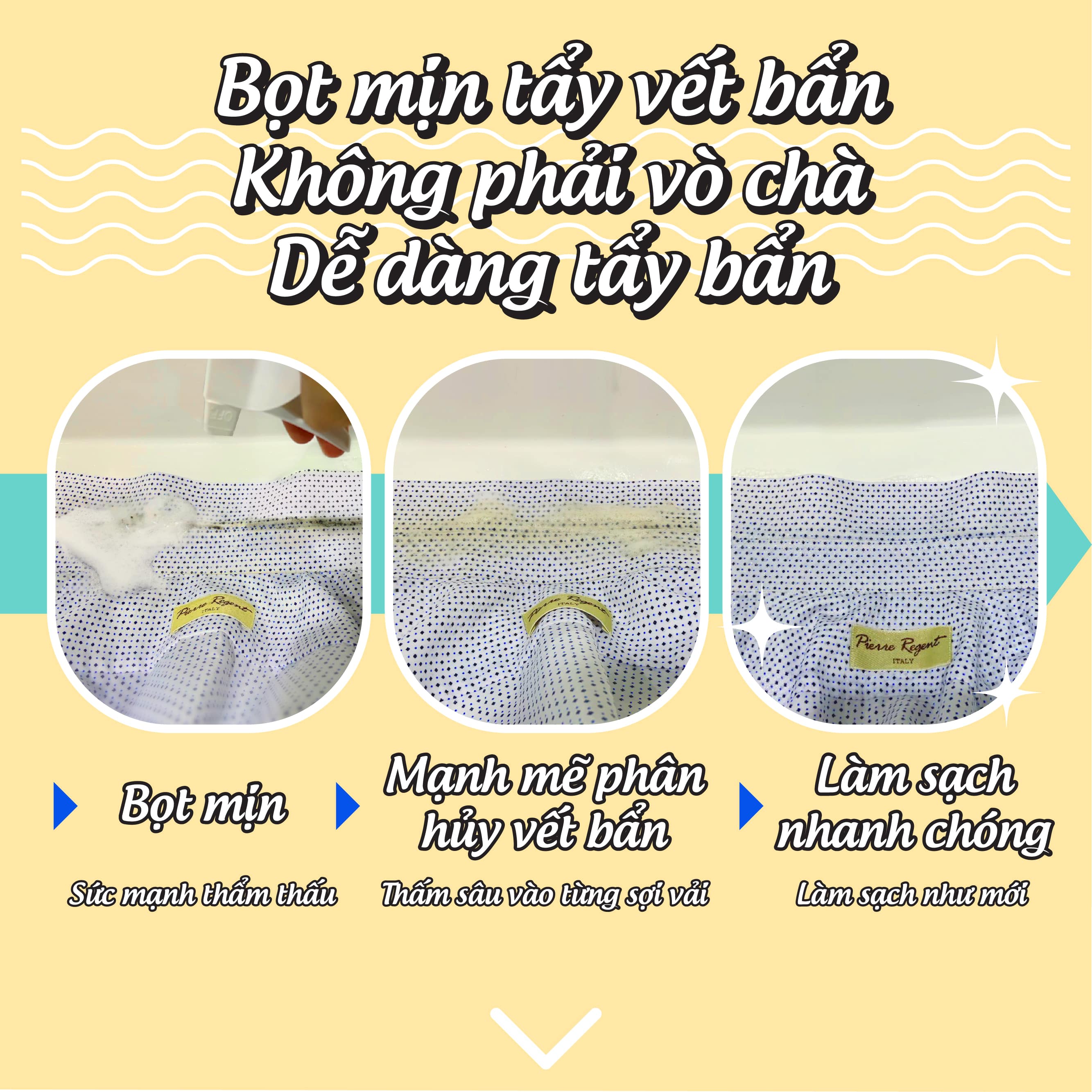 - Làm sạch các vết bẩn thông thường, vết mồ hôi: tẩy sạch các vết bẩn, vết mồ hôi, nước tiểu, vết máu trên quần áo, cổ áo, tay áo, nách áo, ống quần, quần áo lót