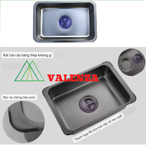 Combo bao gồm: chậu rửa chén bát 1 hố lớn Valenza size 7546 sus304 nano đen kháng khuẩn, vòi rửa bát rút dây Valenza sus304, bộ xả to ngăn mùi, khay inox kín, bình rửa bát cắm chậu, dụng cụ rửa ly cốc.