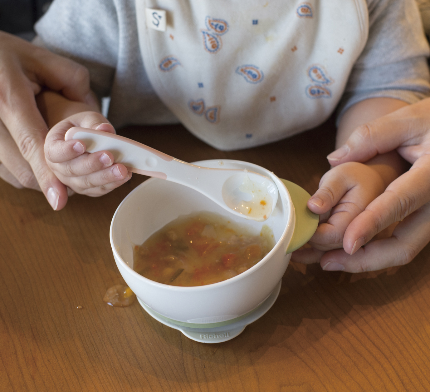Kết hợp Có thể dùng Chén ăn dặm Richell T.L.I bước 2-3 thiết kế hỗ trợ cho bé tập tự ăn với các sản phẩm: