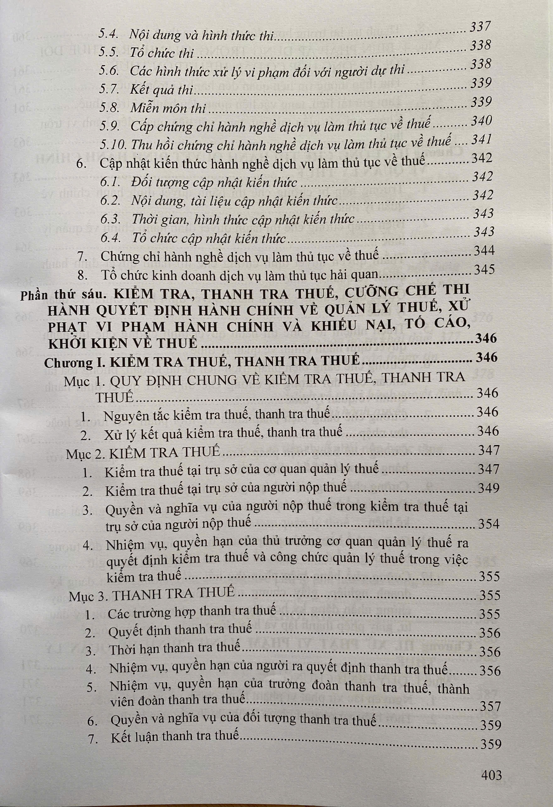 Phần thứ sáu. KIỂM TRA, THANH TRA THUẾ, CƯỠNG CHẾ THI HÀNH QUYẾT ĐỊNH HÀNH CHÍNH VỀ QUẢN LÝ THUẾ, XỬ PHẠT VI PHẠM HÀNH CHÍNH VÀ KHIẾU NẠI, TỐ CÁO, KHỞI KIỆN VỀ THUẾ.