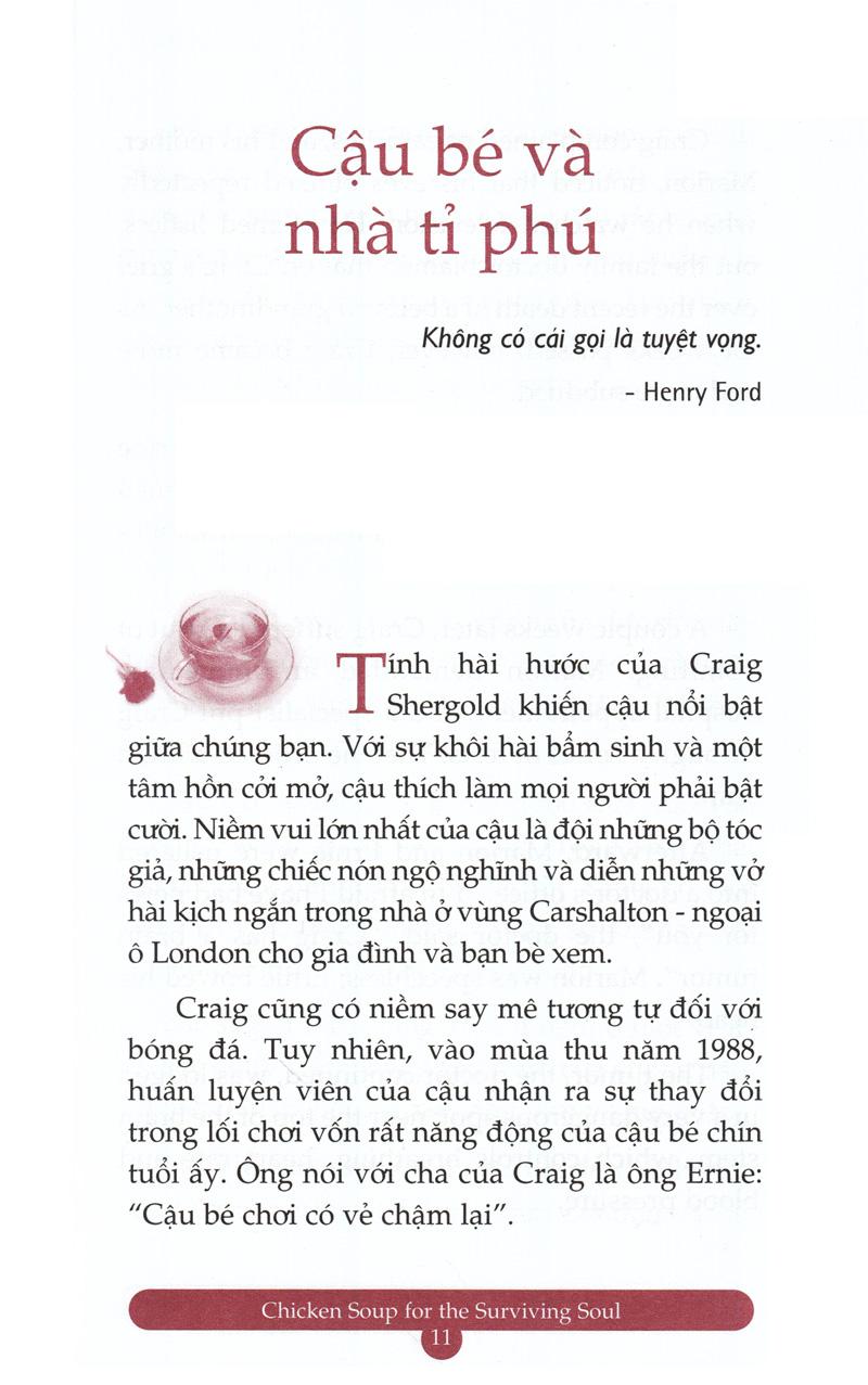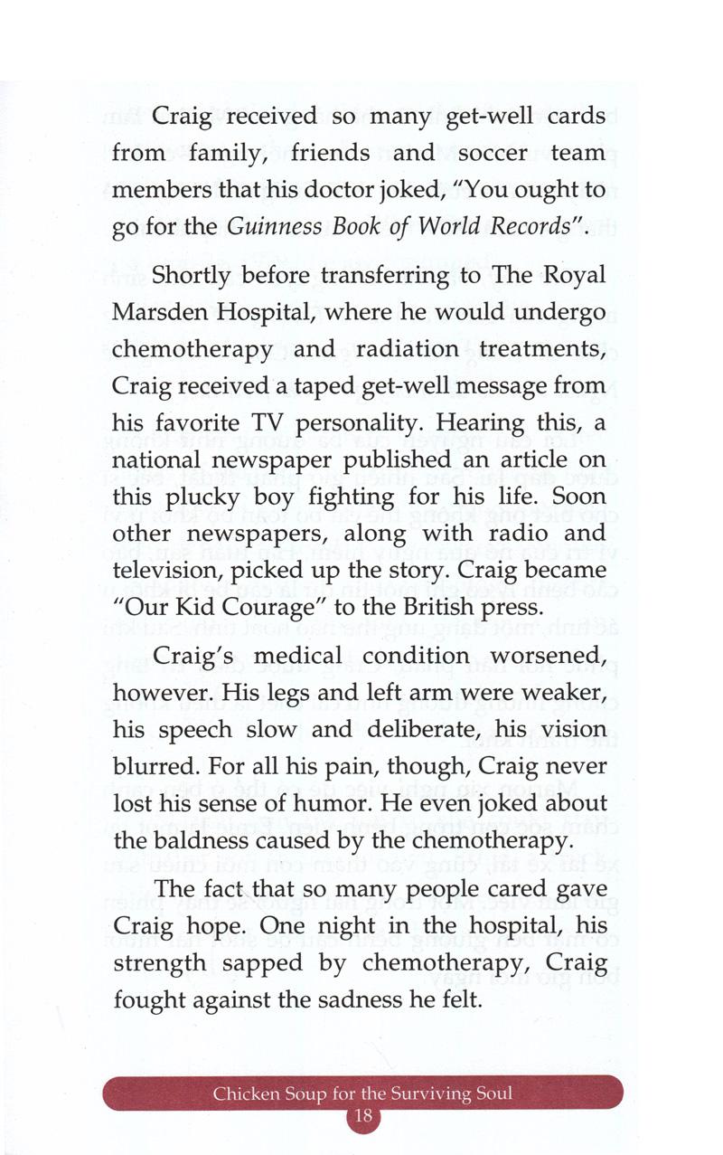 Câu chuyện về cô bé Searra mắc bệnh u não nhắc chúng ta nhớ rằng không nên hời hợt với những người mình yêu thương và phải nhìn nhận sâu sắc hơn những điều nông cạn chúng ta thường gặp trong cuộc số Còn nhiều những câu chuyện khác thật sự làm rung động bạn, mang đến động lực để bạn vượt những khó khăn của chính bản thân mình. Và kết thúc cuốn sách là câu chuyện về những cậu bé tình nguyện cạo trọc đầu để giúp người bạn bị ung thư không bị lạc lõng khi cậu bị rụng tóc do việc hóa trị.