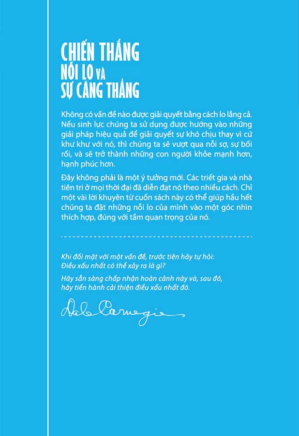 Không có vấn đề nào được giải quyết bằng cách lo lắng cả. Nếu sinh lực chúng ta sử dụng được hướng vào những giải pháp hiệu quả để giải quyết sự khó chịu thay vì cứ khư khư với nó, thì chúng ta sẽ vượt qua nỗi sợ, sự bối rối, và sẽ trở thành những con người khỏe mạnh hơn, hạnh phúc hơn. Đây không phải là một ý tưởng mới. Các triết gia và nhà tiên tri ở mọi thời đại đã diễn đạt nó theo nhiều cách. Chỉ một vài lời khuyên từ cuốn sách này có thể giúp hầu hết chúng ta đặt những nỗi lo của mình vào một góc nhìn thích hợp, đúng với tầm quan trọng của nó. "Khi đối mặt với một vấn đề, trước tiên hãy tự hỏi: Điều xấu nhất có thể xảy ra là gì? Hãy sẵn sàng chấp nhận hoàn cảnh này và, sau đó, hãy tiến hành cải thiện điều xấu nhất đó." (Dale Carnegie)