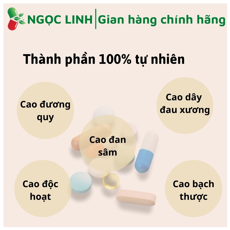 - Thành phần: Thành phần cho 1 viên nang cứng: Glucosamin Sulfat 2NaCl: 60mg Aquamin F (32%Calci, 2,2% Magie): 50mg Cao Dây đau xương: 50mg Cao Đương quy: 45mg Cao Độc hoạt: 45mg Cao Phòng Phong: 45mg Cao Bạch thược: 35mg Cao Đan sâm: 30mg Cao Hồng hoa: 20mg Bột Thiên niên kiện: 15mg Bột xuyên khung: 15mg Cao Lá Khôi: 10mg Chiết xuất cây Nhũ hương: 10mg Quế chi: 2mg Phụ liệu: Đường mía, Canxicacbonat, Magnesium stearate, tinh bột, Nipazil, Nipazol vừa đủ 1 viên nang cứng.