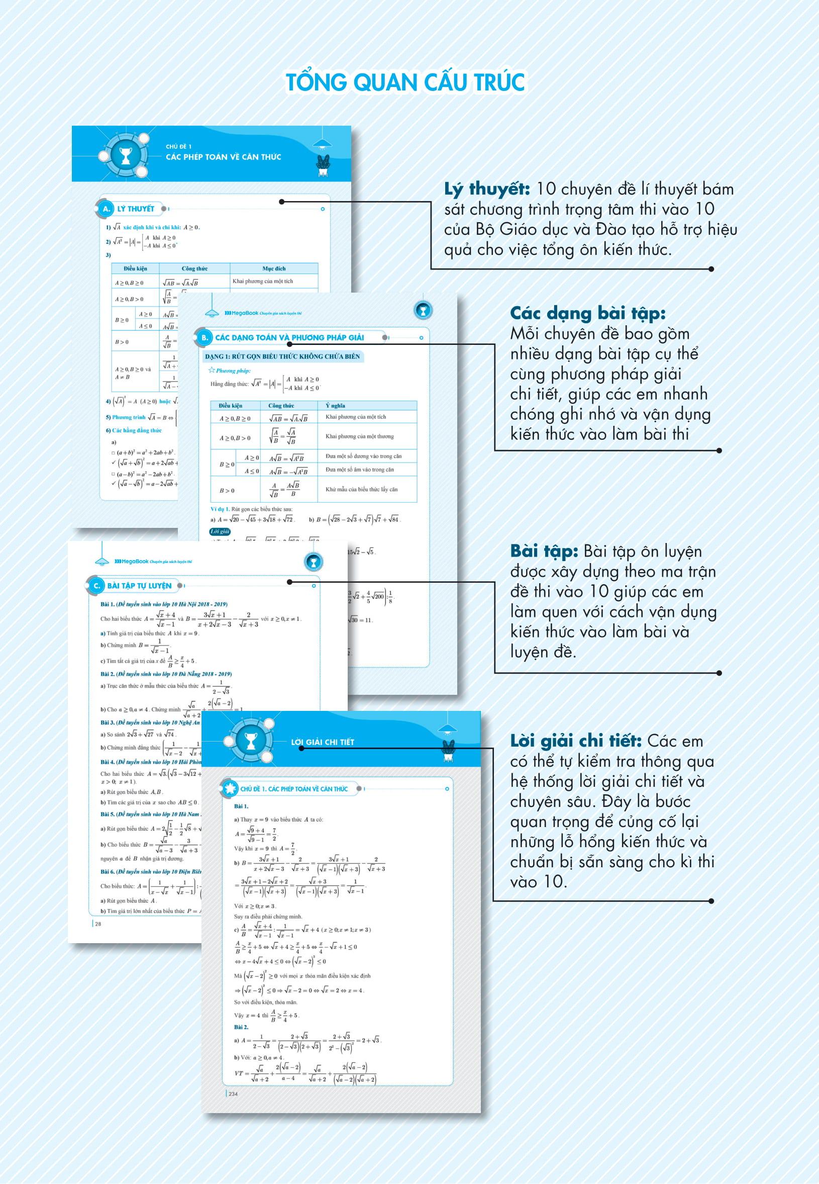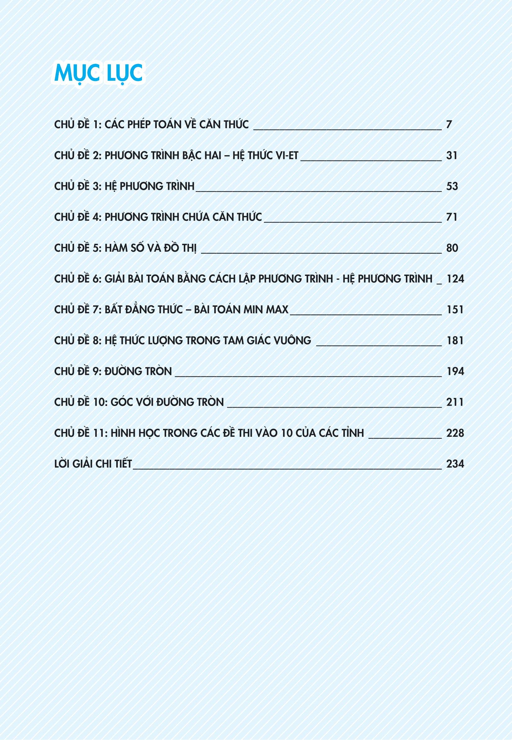 11 chuyên đề lớn 100% xuất hiện trong các đề thi tuyển sinh vào 10 như Căn thức, Phương trình bậc hai – Hệ thức Vi-et, Hệ phương trình, Bất đẳng thức…