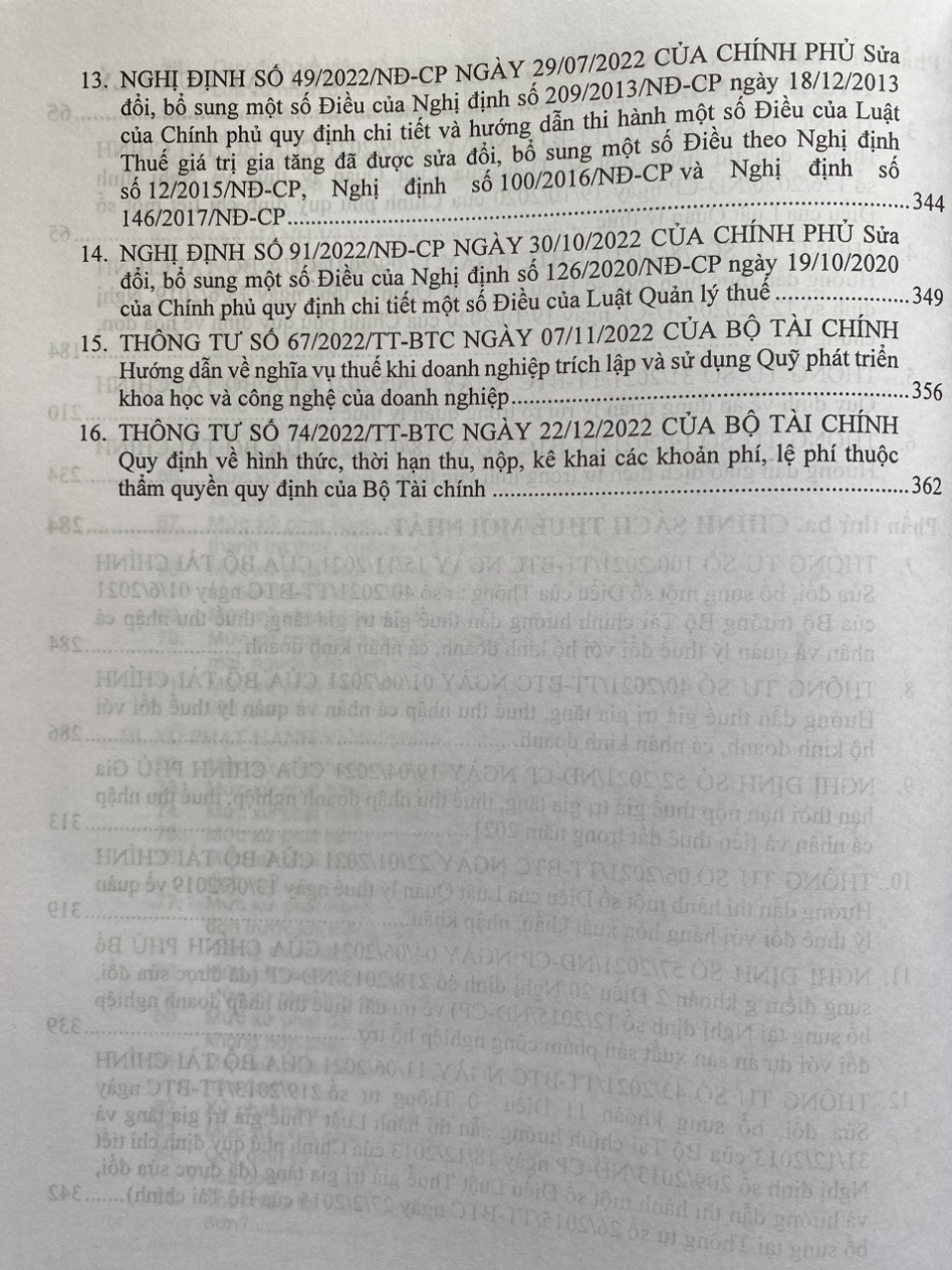Nhằm tiếp tục đẩy mạnh cải cách, hoàn thiện thể chế, chính sách và công tác quản lý thuế, thời gian qua Chính phủ, Bộ Tài chính đã sửa đổi, bổ sung cũng như ban hành nhiều chính sách mới trong lĩnh vực thuế như: Nghị định 91/2022/NĐ-CP ngày 30/10/2022 Sửa đổi, bổ sung một số Điều của Nghị định số 126/2020/NĐ-CP quy định chi tiết một số Điều của Luật Quản lý thuế, Thông tư 74/2022/TT-BTC ngày 22/12/2022 Quy định về hình thức, thời hạn thu, nộp, kê khai các khoản phí, lệ phí thuộc thẩm quyền quy định của Bộ Tài chính, Nghị định 49/2022/NĐ-CP ngày 29/07/2022 Sửa đổi, bổ sung một số Điều của Nghị định số 209/2013/NĐ-CP quy định chi tiết và hướng dẫn thi hành một số Điều của Luật Thuế giá trị gia tăng đã được sửa đổi, bổ sung một số Điều theo Nghị định số 12/2015/NĐ-CP, Nghị định số 100/2016/NĐ-CP và Nghị định số 146/2017/NĐ-CP…