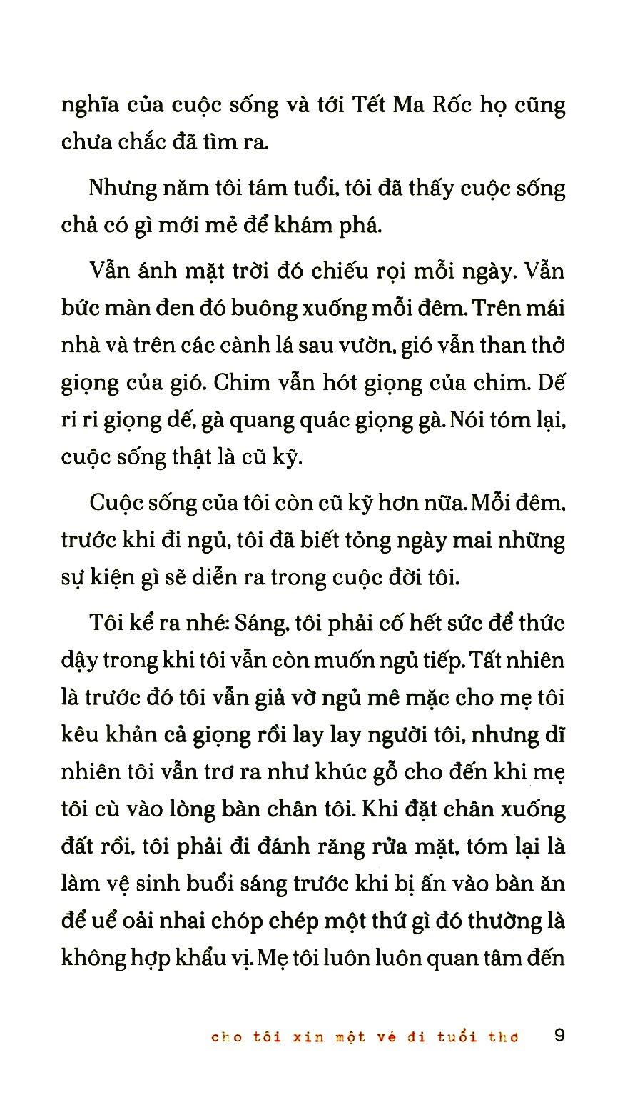 Truyện Cho tôi xin một vé đi tuổi thơ là một trong những tác phẩm bán chạy nhất nhà văn Nguyễn Nhật Ánh. Nhà văn mời người đọc lên chuyến tàu quay ngược trở lại thăm tuổi thơ và tình bạn dễ thương của 4 bạn nhỏ. Những trò chơi dễ thương thời bé, tính cách thật thà, thẳng thắn một cách thông minh và dại dột, những ước mơ tự do trong lòng… khiến cuốn sách có thể làm các bậc phụ huynh lo lắng rồi thở phào. Không chỉ thích hợp với người đọc trẻ, cuốn sách còn có thể hấp dẫn và thực sự có ích cho người lớn trong quan hệ với con m.ình.
