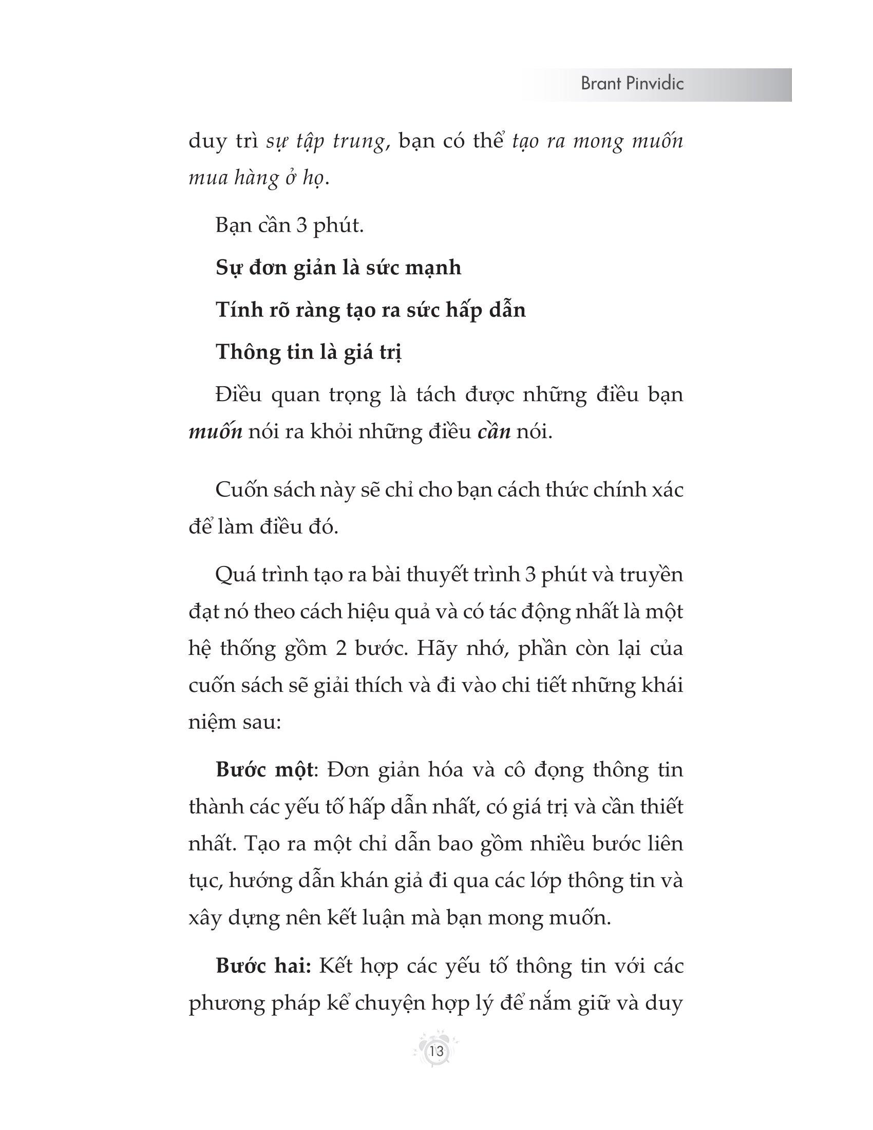 Nếu bạn đang là một người bán hàng muốn đưa ra một tuyệt chiêu hoặc một lời nói thu hút sự chú ý của người mua, hãy làm theo một quy tắc đơn giản: Chỉ truyền đạt những gì cần nói, rõ ràng và chính xác trong vòng 3 phút hoặc ít hơn. Đó cũng chính là thông điệp mà cuốn sách “Chốt đơn trong 3 phút” muốn truyền tải. Dựa trên hiểu biết đó cũng như những đúc rút trong quá trình làm việc, tác giả Brant Pinvidic đã xây dựng nên “Quy tắc 3 phút” nhằm giúp những người thuyết trình, bán hàng truyền tải được đầy đủ những nội dung cần thiết trong khoảng thời gian 3 phút ngắn ngủi.