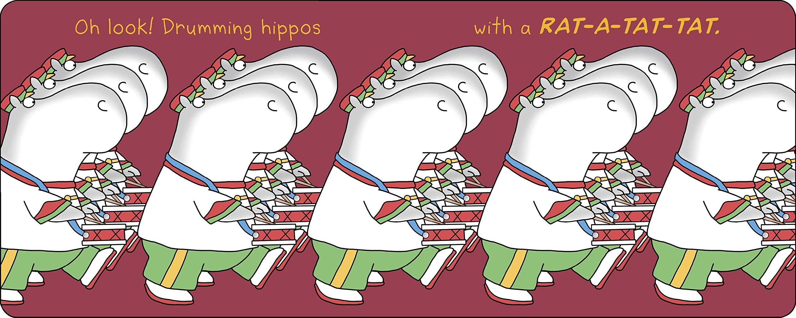 Written with the irresistible rhythm of a lively marching band and illustrated with Boynton’s signature characters, including chickens with bassoons, mice with piccolos, a tiny bird with a large tuba, and a Santa rhino with a sack full of presents, Christmas Parade is a superb present for young children and families everywhere.