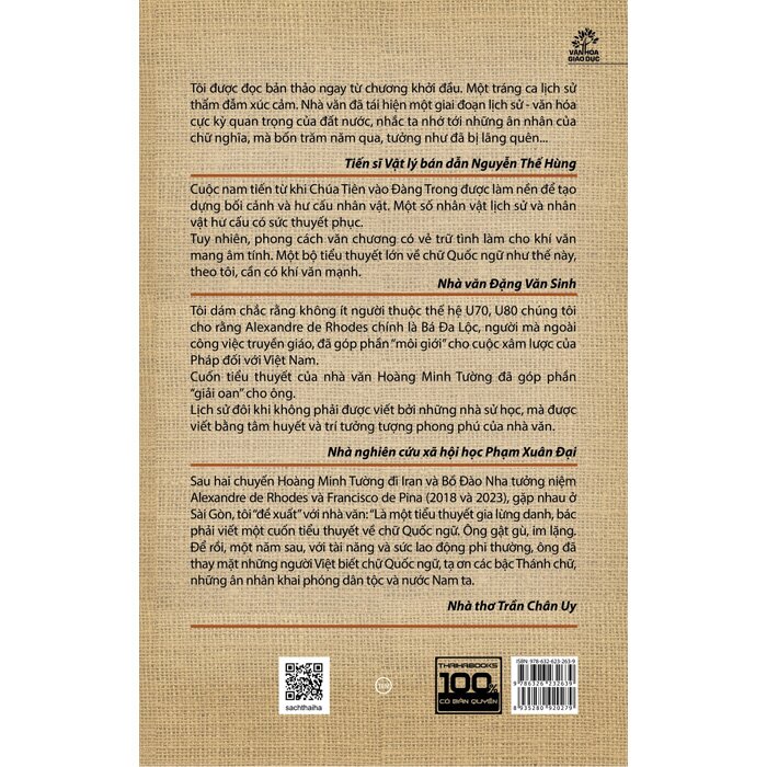 Cuốn sách "Chữ và người, 400 năm..." của nhà văn Hoàng Minh Tường không chỉ là một cuốn tiểu thuyết lịch sử, mà còn là một bản anh hùng ca thiêng liêng về tiếng Việt, ngôn ngữ đã làm say đắm biết bao thế hệ. Tác phẩm đưa chúng ta ngược dòng thời gian về Đàng Trong thế kỷ 17, nơi một thứ chữ viết kỳ diệu được khai sinh từ lòng trân trọng vô bờ dành cho tiếng nói dân tộc.