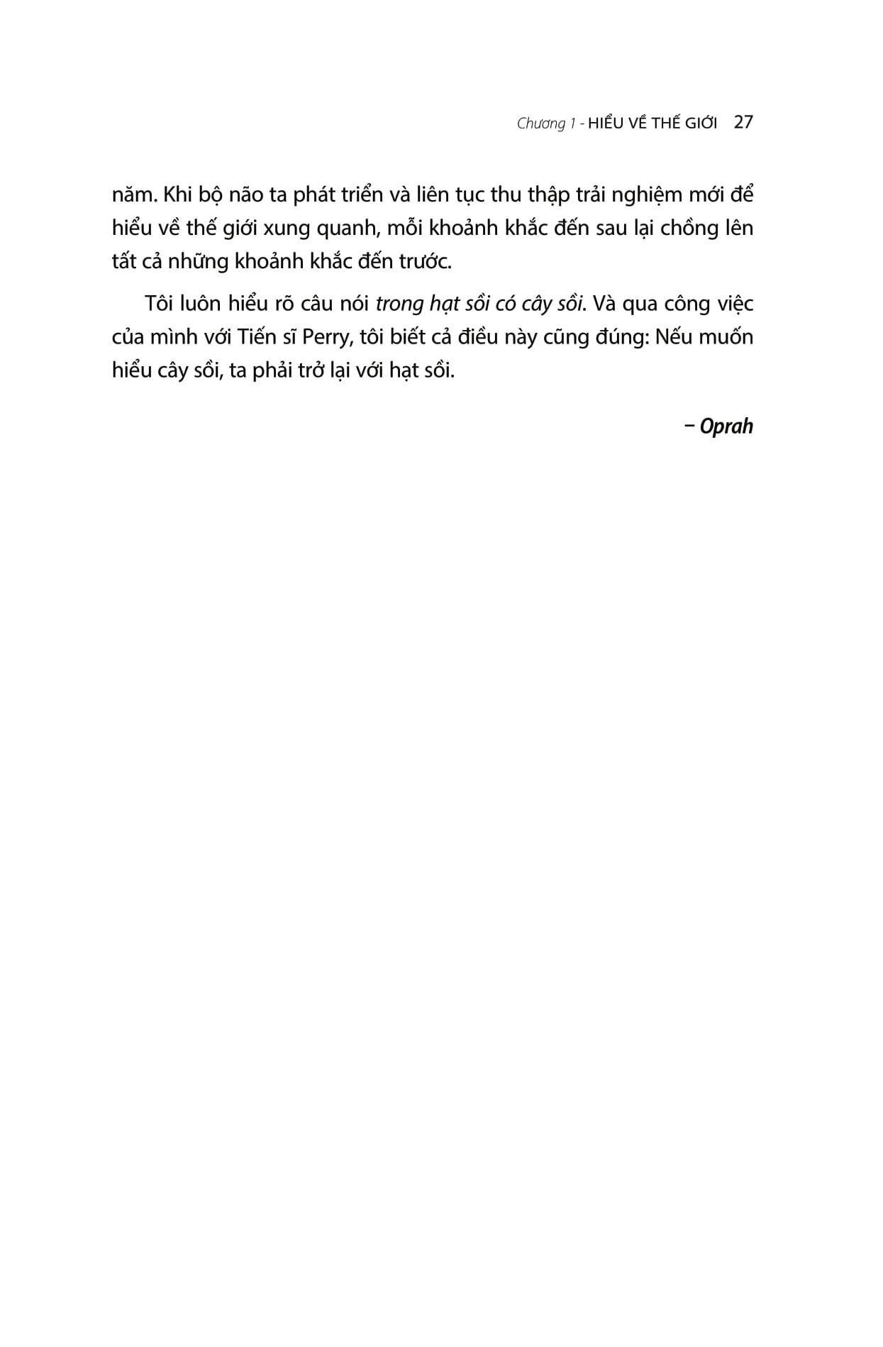 Và câu hỏi cơ bản “Điều gì đã xảy ra?” có thể giúp mỗi chúng ta hiểu thêm một chút về cách mà những trải nghiệm – cả tốt lẫn xấu – định hình con người m.ình. Khi chia sẻ những câu chuyện và khái niệm khoa học này, tác giả hy vọng mỗi người đọc, theo từng cách riêng, sẽ có được những chiêm nghiệm riêng để từ đó có thể sống tốt hơn, trọn vẹn hơn.