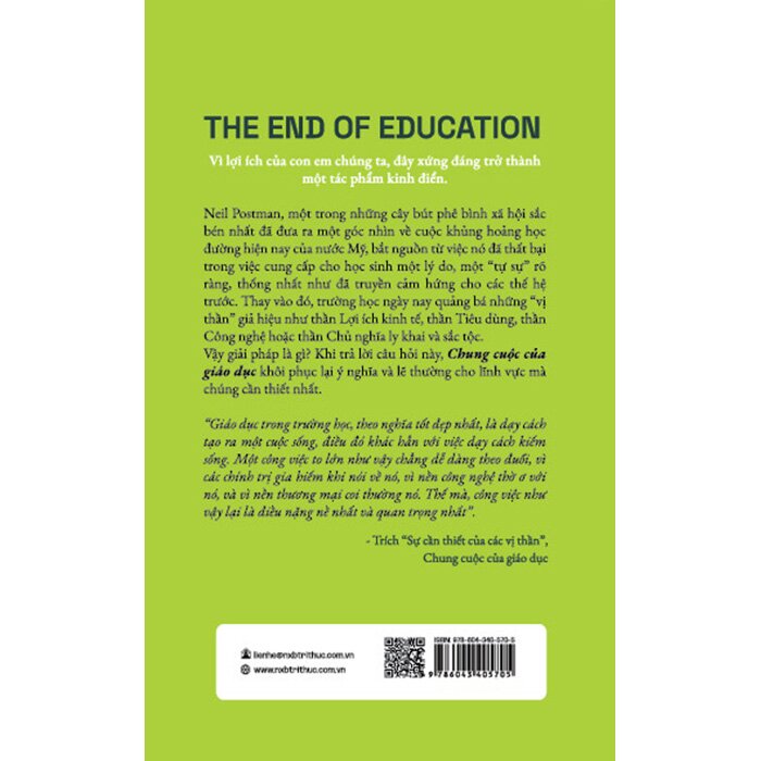 Chung Cuộc Của Giáo Dục Cuốn sách chúng ta đang cùng nhau đọc Chung cuộc của giáo dục (The End of Education) được xuất bản lần đầu vào năm 1995, cách nay hơn một phần tư thế kỷ, khi nước Mỹ đang tìm kiếm những ý tưởng để cải cách giáo dục nhằm vượt qua khủng hoảng học đường. Liệu những gì được tác giả viết ra có là nỗi bận tâm của chúng ta, khi nền giáo dục của chúng ta cũng đang tìm đường “đổi mới căn bản và toàn diện”? Bạn sẽ có câu trả lời riêng sau khi đọc xong cuốn sách này. Với tôi, một giáo viên già, câu trả lời là cầu mong những ai quan tâm đến giáo dục, đặc biệt là những bạn đồng nghiệp còn đang gắn bó với nghề dạy học, đọc và ngẫm nghĩ về những gì tác giả thảo luận với chúng ta. Và hy vọng các nhà hoạch định và quản trị nền giáo dục nước nhà tìm thấy ở đây những ý kiến khơi gợi suy tư theo hướng phản biện đối với những gì được cho là chính thống.