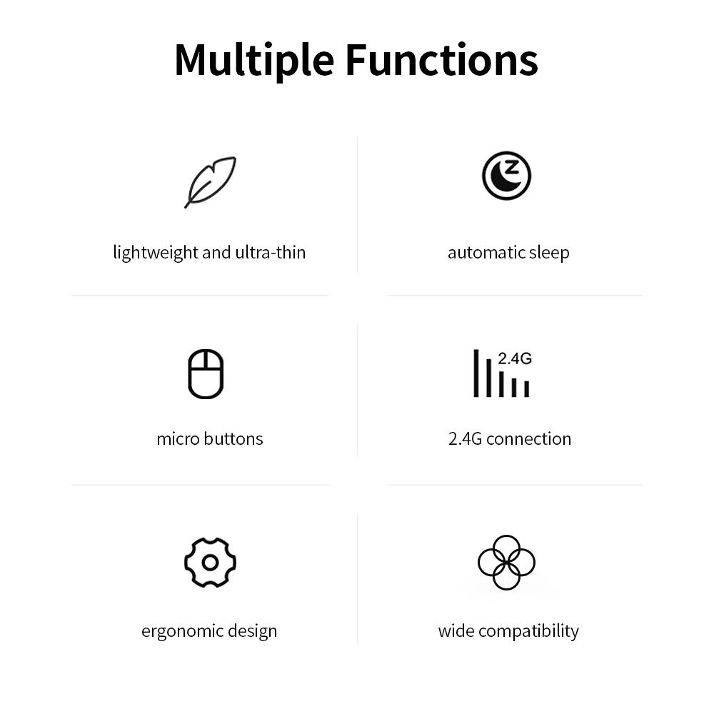 Features: 2.4G Wireless Transmission Technology 2.4GHZ wireless transmission, 8-10meters distance, effectively avoid the interference of BT and WIFI, and ensure the stability of wireless transmission. Low Decibel Keys The mouse has low-decibel buttons with a