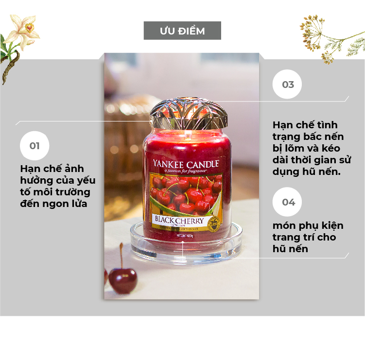 Trọng lượng: 390g Thời gian cháy: 60h Sáp: plam blend Bấc nến: sợi coton 1 tim Màu: hồng, cam, trắng, vàng - Công dụng: Trang trí cho không gian trong nhà (phòng bếp, phòng khách)