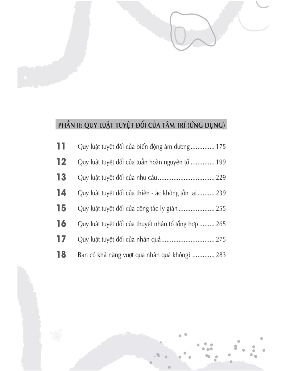 - Phần lý thuyết: từ chương 1 đến chương chương 10: Phân tích và nhìn nhận các khía cạnh trong đời sống cũng như xã hội dưới góc nhìn mới thông qua các quy luật tuyệt đối của tâm trí.