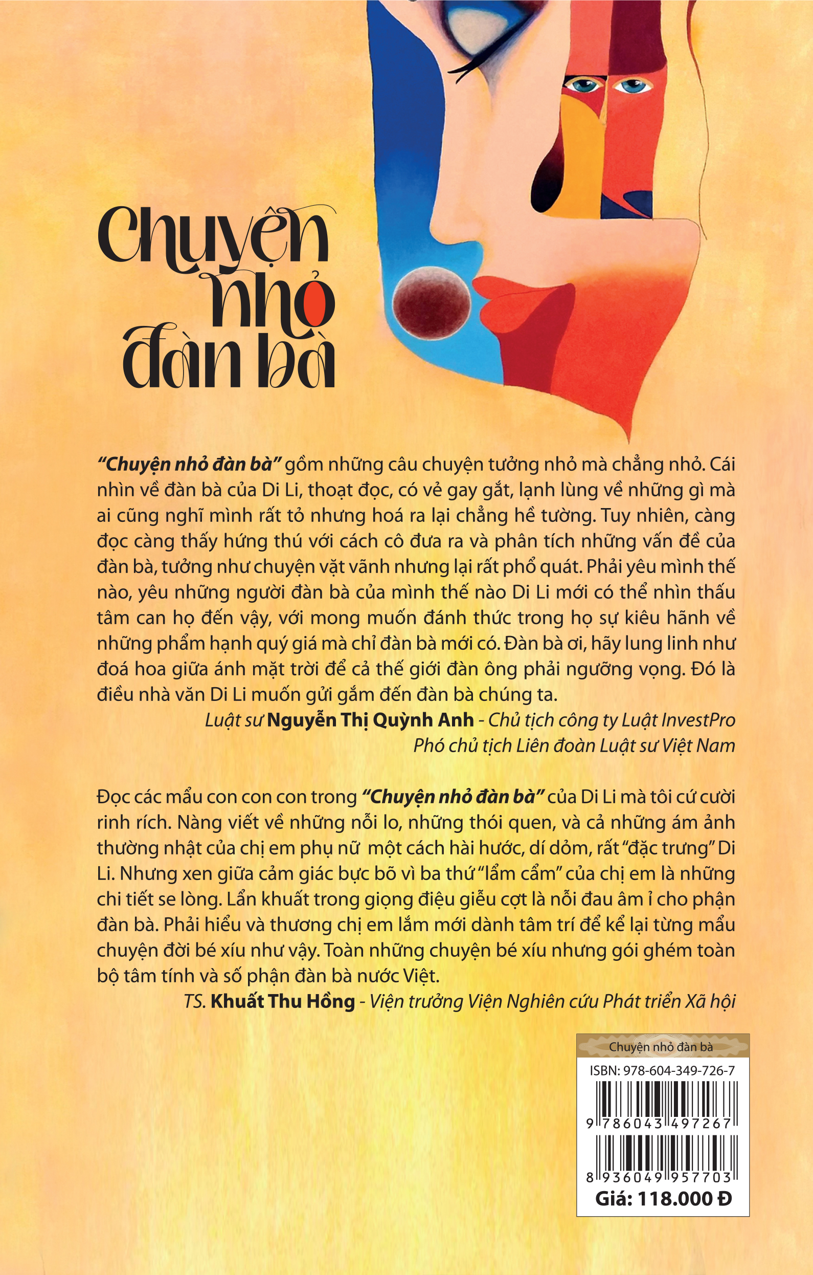 “Chuyện nhỏ đàn bà” gồm những câu chuyện tưởng nhỏ mà chẳng nhỏ. Cái nhìn về đàn bà của Di Li, thoạt đọc, có vẻ gay gắt, lạnh lùng về những gì mà ai cũng nghĩ mình rất tỏ nhưng hoá ra lại chẳng hề tường. Tuy nhiên, càng đọc càng thấy hứng thú với cách cô đưa ra và phân tích những vấn đề của đàn bà, tưởng như chuyện vặt vãnh nhưng lại rất phổ quát. Phải yêu mình thế nào, yêu những người đàn bà của mình thế nào Di Li mới có thể nhìn thấu tâm can họ đến vậy, với mong muốn đánh thức trong họ sự kiêu hãnh về những phẩm hạnh quý giá mà chỉ đàn bà mới có. Đàn bà ơi, hãy lung linh như đoá hoa giữa ánh mặt trời để cả thế giới đàn ông phải ngưỡng vọng. Đó là điều nhà văn Di Li muốn gửi gắm đến đàn bà chúng ta.