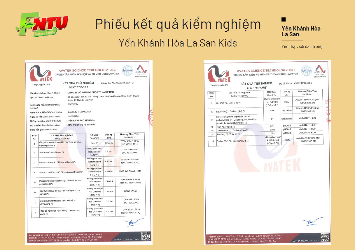 Yến Khánh Hòa La San Kids: được chế biến theo phương pháp truyền thống, kết hợp với công nghệ hiện đại trên dây chuyền thiết bị tiên tiến từ châu Âu. Điều này không chỉ giữ trọn vẹn hương vị tự nhiên mà còn bảo toàn tối đa các dưỡng chất quý giá có trong yến.