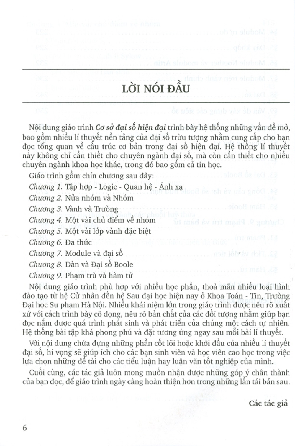 Chương 1: Tập hợp - Logic - Quan hệ - Ánh xạ Chương 2: Nửa nhóm và Nhóm Chương 3: Vành và Trường Chương 4: Một vài chủ điểm về nhóm Chương 5: Một vài lớp vành đặc biệt Chương 6: Đa thức Chương 7: Mudule và đại số Chương 8: Dàn và Đại số Boole Chương 9: Phạm trù và hàm tử