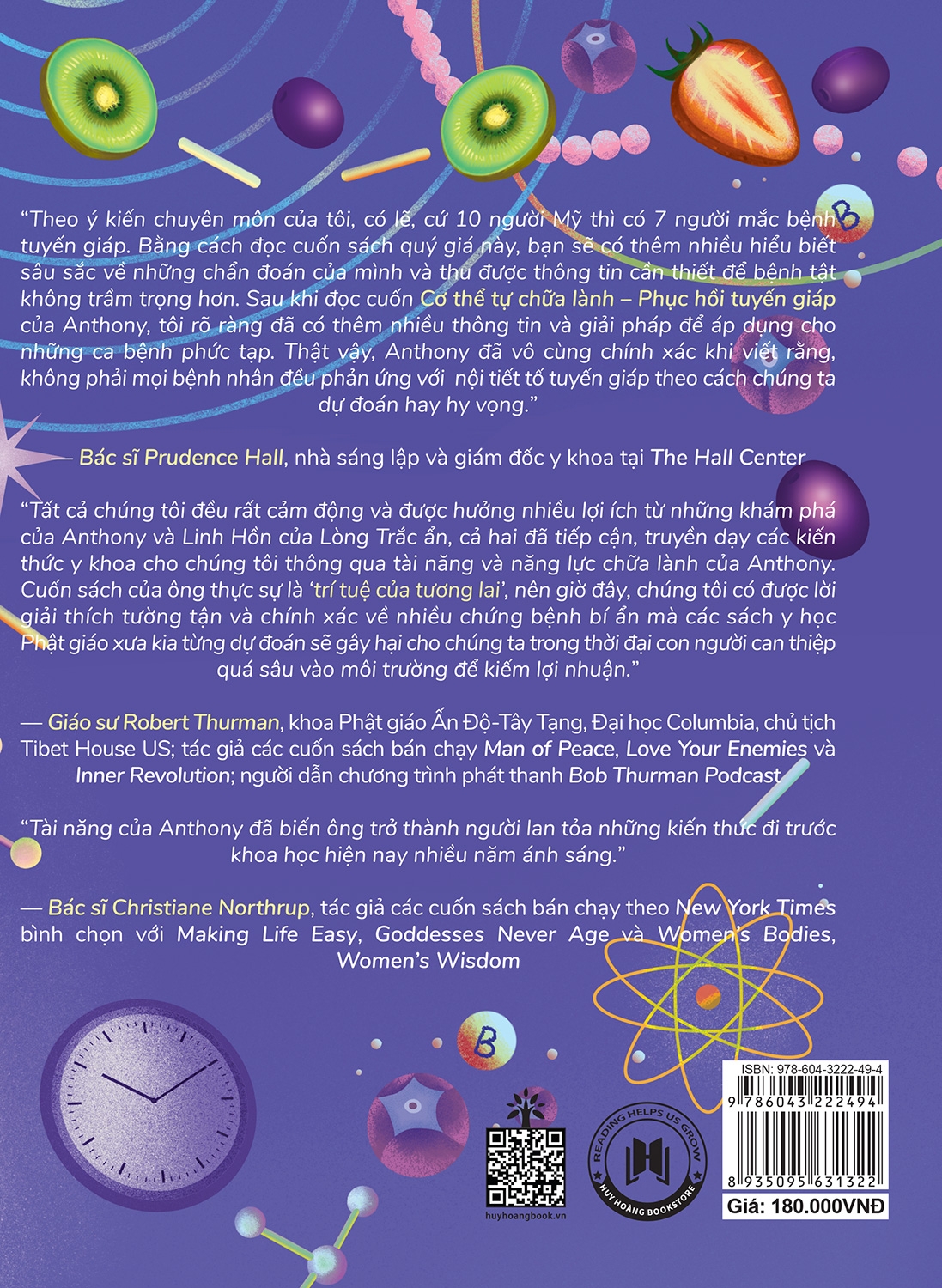“Theo ý kiến chuyên môn của tôi, có lẽ, cứ 10 người Mỹ thì có 7 người mắc bệnh tuyến giáp. Bằng cách đọc cuốn sách quý giá này, bạn sẽ có thêm nhiều hiểu biết sâu sắc về những chẩn đoán của mình và thu được thông tin cần thiết để bệnh tật không trầm trọng hơn. Sau khi đọc cuốn Cơ thể tự chữa lành – Phục hồi tuyến giáp của Anthony, tôi rõ ràng đã có thêm nhiều thông tin và giải pháp để áp dụng cho những ca bệnh phức tạp. Thật vậy, Anthony đã vô cùng chính xác khi viết rằng, không phải mọi bệnh nhân đều phản ứng với nội tiết tố tuyến giáp theo cách chúng ta dự đoán hay hy vọng.”