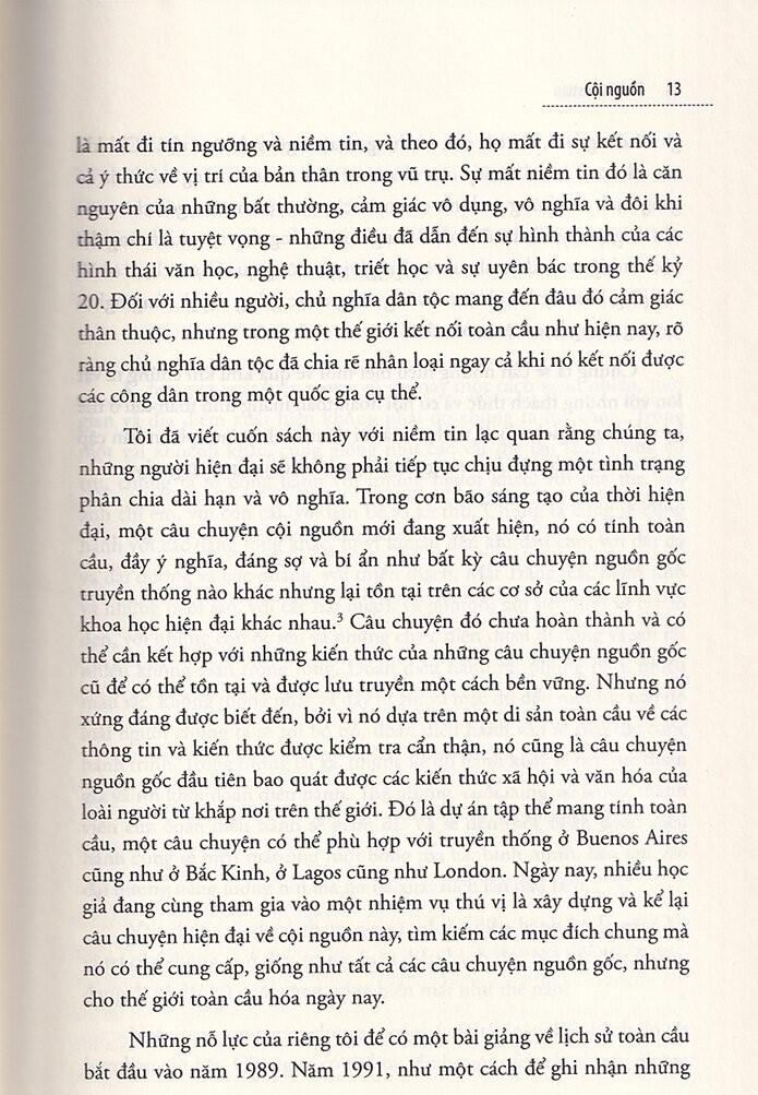 Tôi đã viết cuốn sách này với niềm tin lạc quan rằng chúng ta, những người hiện đại sẽ không phải tiếp tục chịu đựng một tình trạng phân chia dài hạn và vô nghĩa. Trong cơn bão sáng tạo của thời hiện đại, một câu chuyện cội nguồn mới đang xuất hiện, nó có tính toàn cầu, đầy ý nghĩa, đáng sợ và bí ẩn như bất kỳ câu chuyện nguồn gốc truyền thống nào khác nhưng lại tồn tại trên các cơ sở của các lĩnh vực khoa học hiện đại khác nhau.