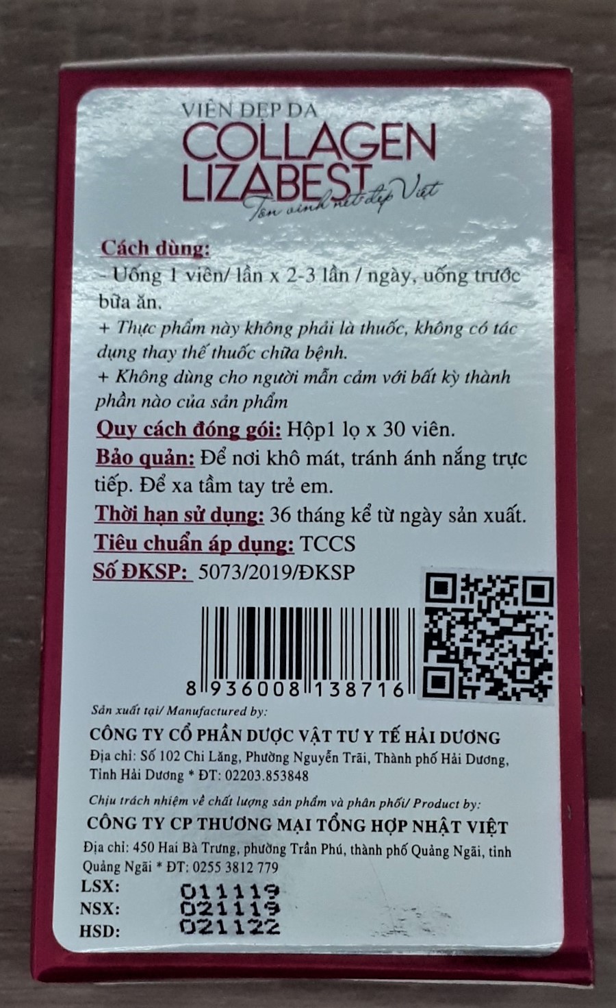Mua tại TiktokCOLLAGEN LIZABEST Quy Cách Đóng Gói: Hộp 1 Lọ x 30 viên Thành phần: Trong 1 viên Bột nhau thai cừu (Sheep placenta powder) 100 mg Collagen 100 mg L-Cystine 100 mg Vitamin E 5% 100 mg Alo Vera Extract 50 mg Vitamin C 20 mg Coenzym Q10 10 mg Kẽm Gluconat (Tương đương 1.4 mg Kẽm) 10 mg Vitamin PP 10 mg Royall jelly 5 mg DHA 10% 5 mg Beta Caroten 10% 1 mg Biotin 30 mcg Phụ liệu Vừa đủ 1 viên Công dụng :