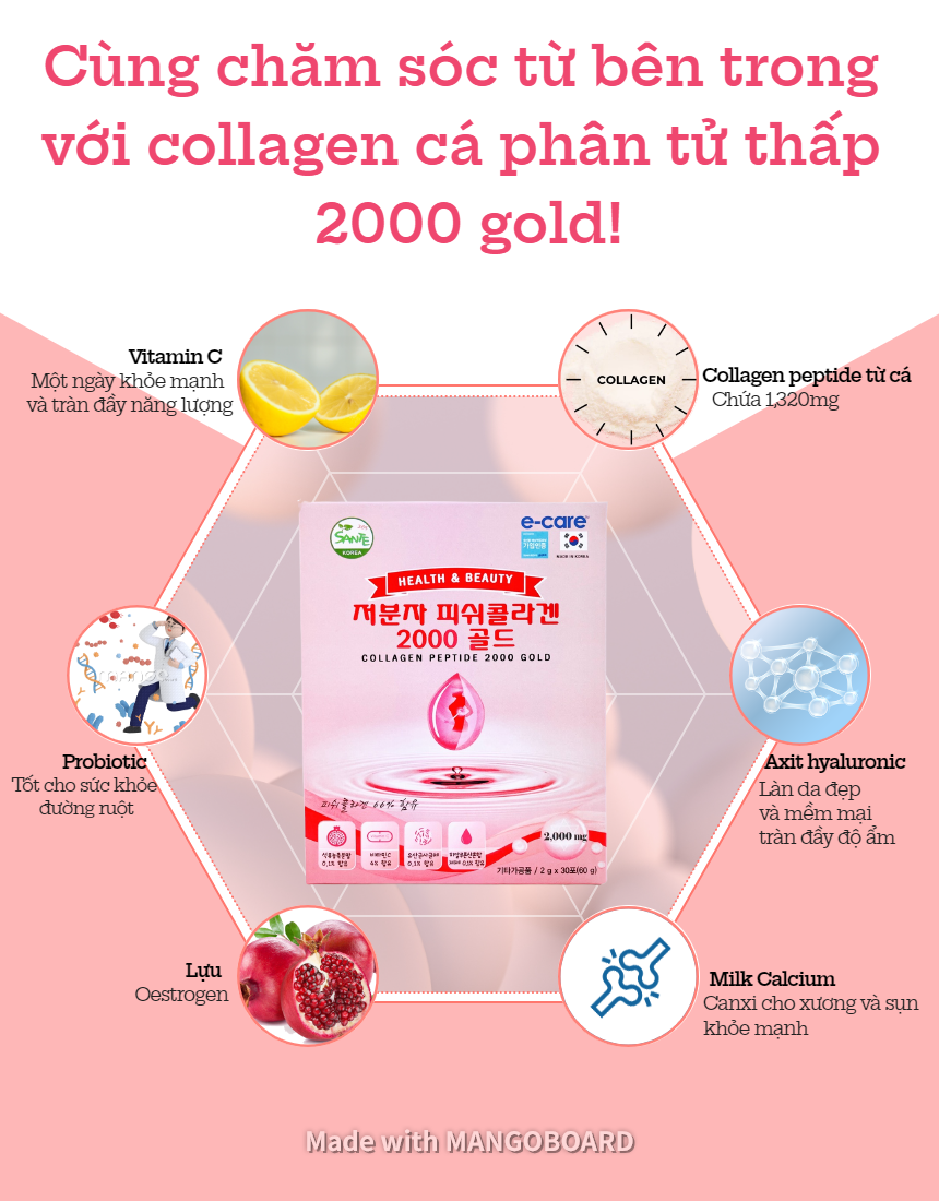 Collagen peptide Gold 2000 : - Dạng bột 2g trong túi nhỏ, dễ pha, dễ mang theo. Hộp 90 gói dùng trong 3 tháng - Mùi vị: collagen cá nhưng không tanh cá nhờ sự