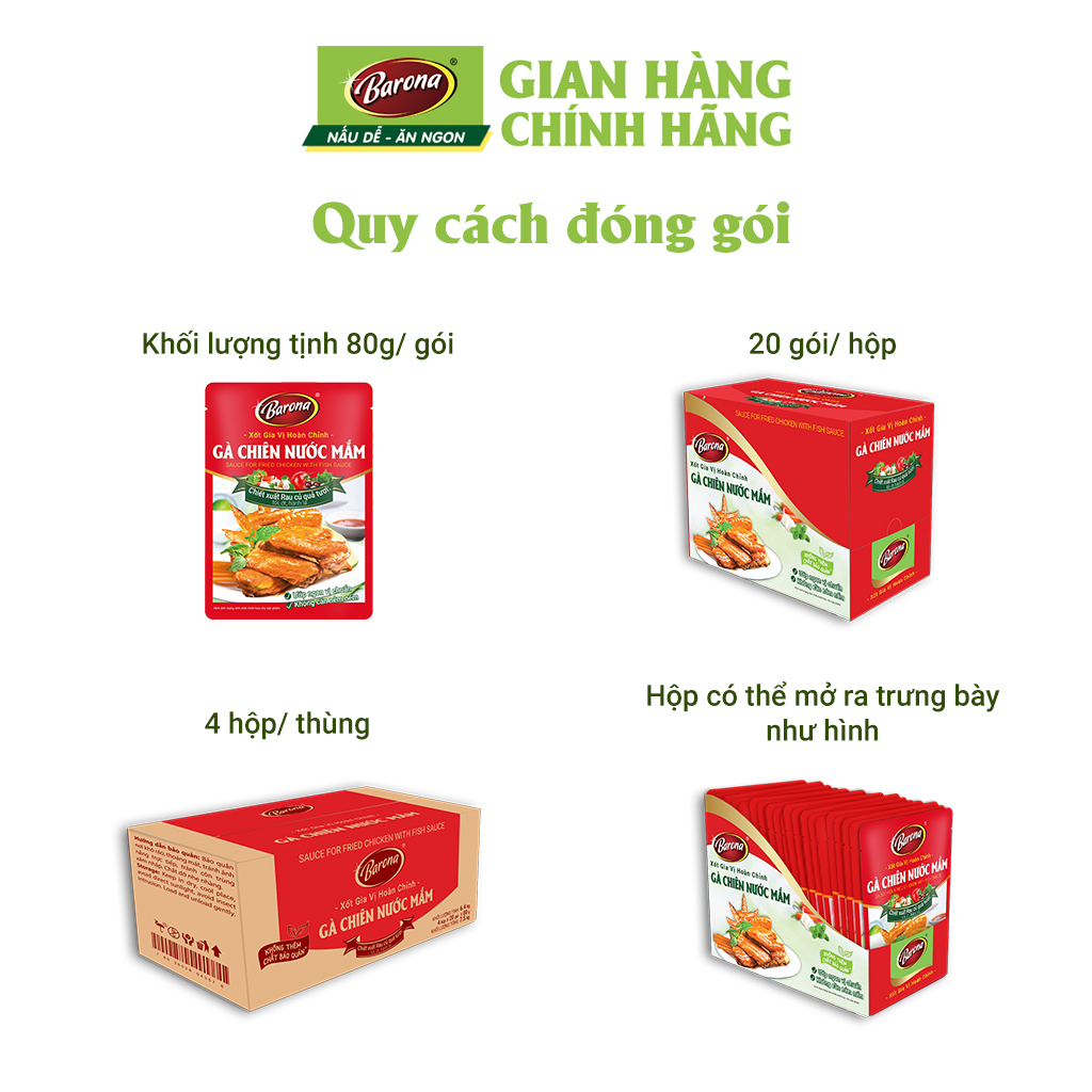 XỐT GIA VỊ HOÀN CHỈNH BARONA GÀ CHIÊN NƯỚC MẮM 80G   Xốt Gia Vị Hoàn Chỉnh Barona là công thức phối trộn độc đáo giữa CHIẾT XUẤT RAU CỦ QUẢ TƯƠI như tỏi, ớt, hành lá…cùng các loại gia vị truyền thống được chọn lọc, đem đến món ngon chuẩn vị trong tích tắc mà KHÔNG CẦN NÊM NẾM thêm bất kỳ gia vị nào khác.   ĐIỂM MẠNH: Xốt Gia Vị Hoàn Chỉnh Barona Gà Chiên Nước Mắm có thể dùng cho thịt ếch, mực, cá đều rất ngon   QUY CÁCH: HSD: 12 tháng HƯỚNG DẪN THỰC HIỆN: Chuẩn bị: 500g thịt gà (cánh/ đùi gà)01 gói Xốt Gia Vị Hoàn Chỉnh Barona – Gà Chiên Nước Mắm 80g Bước 1: Chiên vàng 500g thịt gà. Bước 2: Vớt thịt gà ra để ráo dầu và bỏ phần dầu còn dư. Bước 3: Cho 1 gói Xốt Gia Vị Hoàn Chỉnh - Gà Chiên Nước Mắm vào đảo với thịt gà trong 2-3 phút trên chảo nóng để xốt phủ đều, gà thấm vị là dùng được