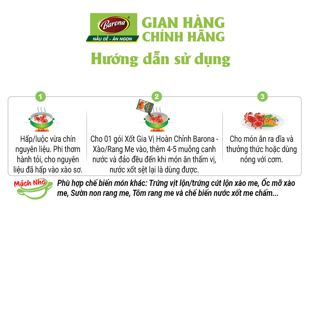 Gia Vị Xào/ Rang Me Barona 80g ướp ngon chuẩn vị không cần nêm nếm Xốt Gia Vị Hoàn Chỉnh Barona Xào/ Rang Me 80g là công thức phối trộn độc đáo giữa CHIẾT XUẤT RAU CỦ QUẢ TƯƠI như tỏi, ớt, hành lá…cùng các loại gia vị truyền thống được chọn lọc, đem đến món ngon chuẩn vị trong tích tắc mà KHÔNG CẦN NÊM NẾM thêm bất kỳ gia vị nào khác. *Hạn sử dụng: 12 tháng kể từ ngày sản xuất