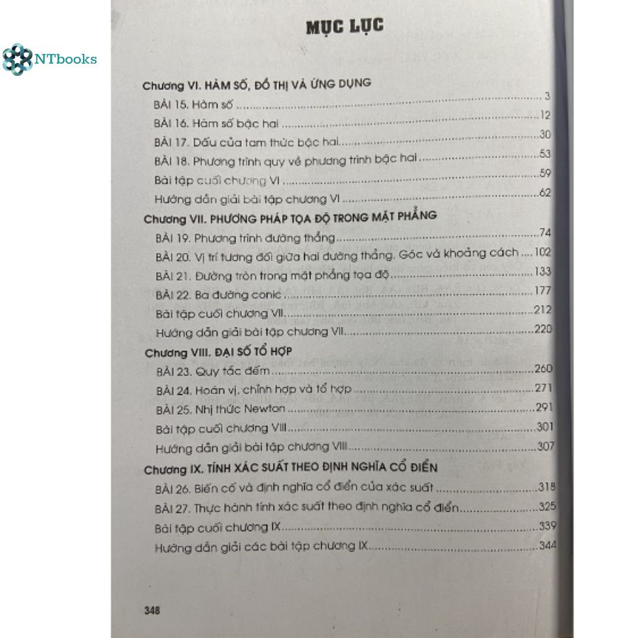 Mua tại TiktokTập 1 gồm các chương: Chương I: MỆNH ĐỀ - TẬP HỢP Chương II: BẤT PHƯƠNG TRÌNH VÀ HỆ BẤT PHƯƠNG TRÌNH BẬC NHẤT HAI ẨN Chương III: HỆ THỨC LƯỢNG TRONG TAM GIÁC Chương IV: VECTO Chương V: CÁC SỐ ĐẶC TRƯNG CỦA MẪU SỐ LIỆU KHÔNG GHÉP NHÓM Tập 2 gồm các chương: Chương VI: Hàm số, đồ thị và ứng dụng Chương VII: Phương pháp tọa độ trong mặt phẳng Chương VIII: Đại số tổ hợp Chương IX: Tính xác suất theo định nghĩa cổ điển NTBOOKS CAM KẾT: