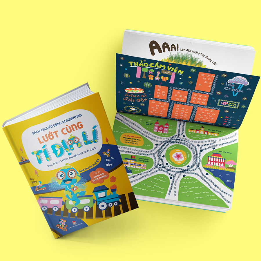 Sách Chuyển Động Scanimation - Lướt Cùng Tí Địa Lí ------------ Lướt cùng Tí Địa Lí – quyển sách chuyển động scanimation đầu tiên của tác giả Việt Nam, dành cho lứa tuổi 4+