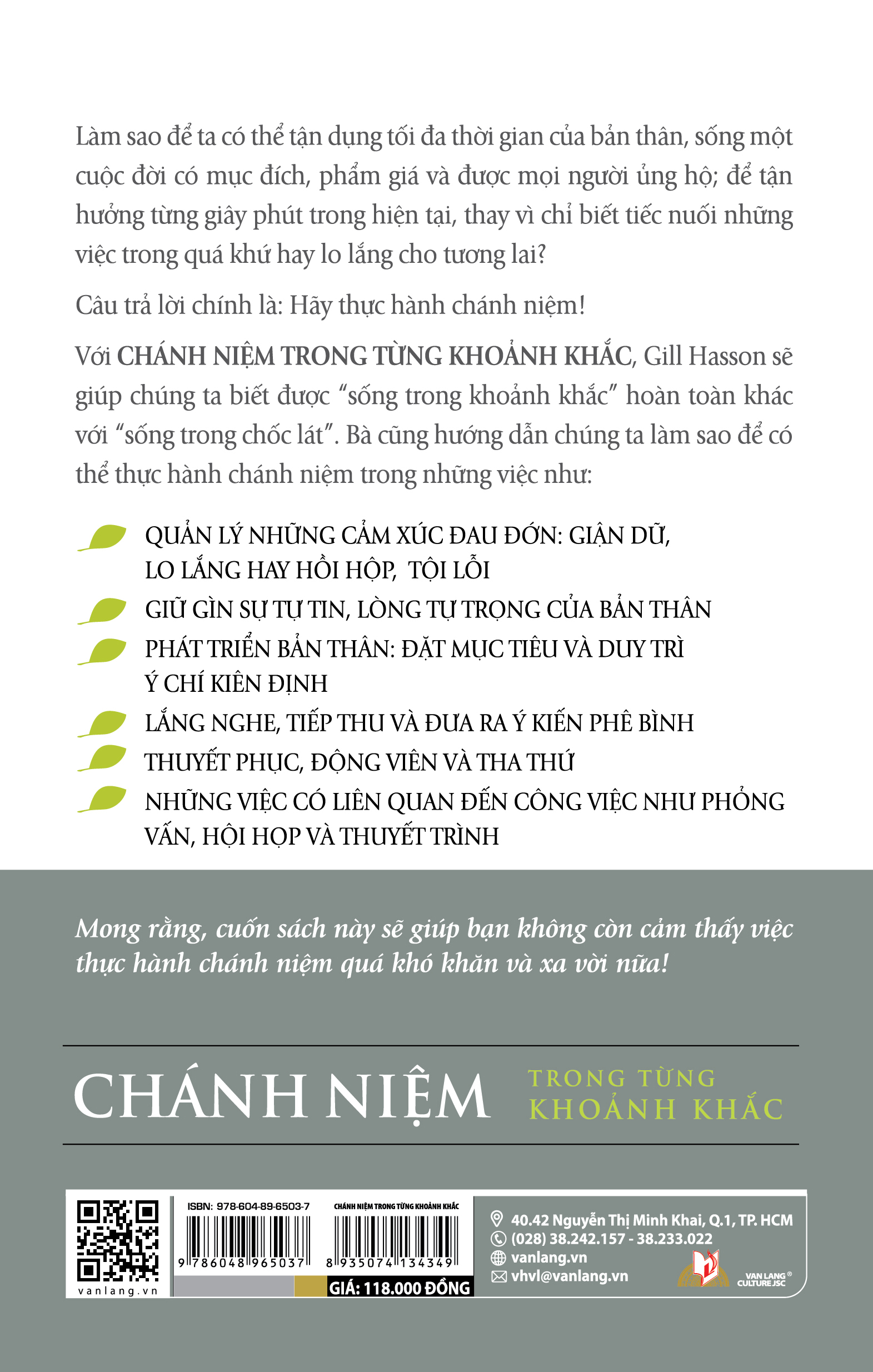 Với Chánh niệm trong từng khoảnh khắc, Gill Hasson sẽ giúp chúng ta biết được “sống trong khoảnh khắc” hoàn toàn khác với “sống trong chốc lát”. Bà cũng hướng dẫn chúng ta làm sao để có thể thực hành chánh niệm trong những việc như: