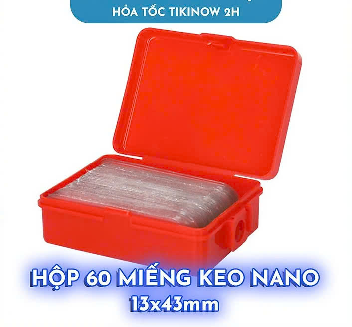 Mô tả sản phẩm Hộp 60 Miếng Keo Nano 2 Mặt Trong Suốt Chống Nước, Không Để Vết Keo Kích thước: 13 x 43mm (cỡ một ngón tay út) Chuyên dụng để dán tranh ảnh, áp phích lên tường, khi tháo không để lại vết keo. Lưu ý: chỉ dán lên bề mặt trơn bóng như gạch men, kí Không dán trên đá, tường, gạch, vôi, sơ Chất liệu nano PU keo chất kết dính hai mặt, siêu bền, tính đàn hồi tốt Chống nước tốt, chịu nhiệt và chống lạnh, tái sử dụng dễ dàng Lực dính và giữ vật dụng cực tốt, sử dụng cho mọi bề mặt Đa năng, sử dụng cho phòng tắm, phòng bếp, bàn học,…