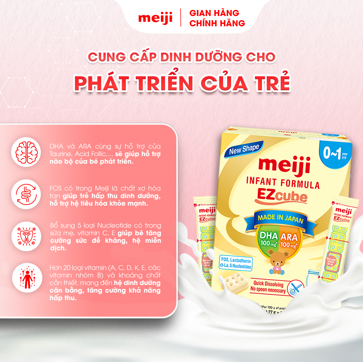 - Ưu điểm sản phẩm Meiji Infant Formula EZcube dạng viên được đóng gói trong túi nhỏ gọn, mẹ chỉ cần mang vài thanh thay vì mang lon sữa cồng kềnh và đặc biệt dễ dàng thuận tiện khi pha, không lo rơi vãi, không sợ đong nhầm. CÔNG DỤNG SẢN PHẨM
