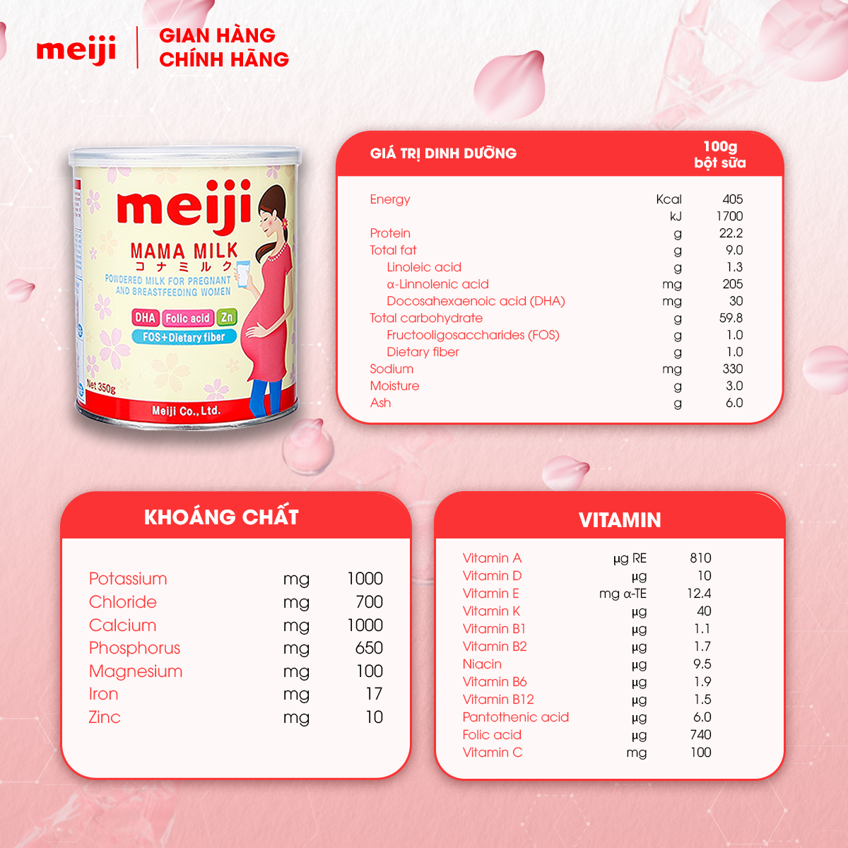 - Meiji Mama Milk hỗ trợ trên 30% lượng khuyến nghị của 13 khoáng chất và Vitamin cần thiết khi mang thai và cho con bú. theo quy định của FAO/WHO.