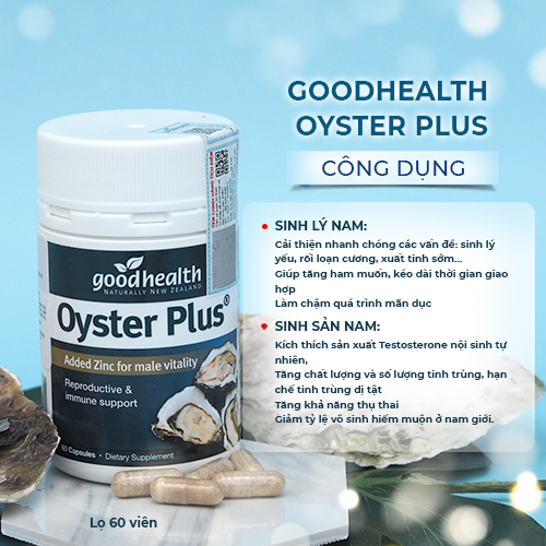 - Ảnh hưởng quá trình sản xuất Testosteron. Gây rối loạn cương dương, giảm ham muốn. Ảnh hưởng rất nhiều đến đời sống vợ chồng nói riêng và cuộc sống nói chung. CHÚ Ý: Nhiều người do giảm ham muốn nên đã vội vã sử dụng các sản phẩm kích thích sinh lý tạm thời trước mắt mà không nghĩ đến tác hại lâu dài về sau. Khuyến cáo Quý khách không nên sử dụng các sản phẩm kích thích sinh lý. Oyster Plus là thực phẩm chức năng giúp bổ sung kẽm kích thích quá trình sản sinh Testoterone, đi sâu vào trực tiếp vấn đề một cách tự nhiên. Nhờ vậy sẽ an toàn cho người sử dụng và kết quả sẽ duy trì ngay cả khi không sử dụng nữa. Khác xa các sản phẩm kích thích sinh lý. SỬ DỤNG GOODHEALTH OYSTER PLUS Qua đây, bạn đã hiểu tác dụng của kẽm đối với cơ thể nam giới. Có rất nhiều cách để bổ sung kẽm cho cơ thể. Như đã đề cập ở trên, bạn có thể sử dụng các món ăn hải sản, đặc biệt là hàu. Hàu chứa rất nhiều kẽm. Nhưng vì những lý do như mùi vị, giá cả, địa điểm nên không phải lúc nào bạn cũng có thể sử dụng và chính việc không thường xuyên liên tục như vậy sẽ dẫn đến không đạt hiệu quả cao. Việc sử dụng Goodhealth Oyster Plus như là một giải pháp tuyệt vời cho bạn trong hoàn cảnh này. Vừa tiện dụng, lượng kẽm lại dồi dào không phải từ biển Việt Nam hay nước nào khác mà chính là vùng biển sâu New Zealand – một trong những vùng biển sạch nhất trên thế giới. Từ đó cho ra các con Hàu sạch với hàm lượng kẽm cao. Không cần phải đi New Zealand, nhưng bạn vẫn được hưởng chất lượng hàu tốt nhất khi sử dụng Goodhealth Oyster Plus. Sản phẩm được nhập khẩu chính hãng từ Goodhealth New Zealand bởi Goodhealth Vietnam. Khi mua hàng qua công ty Goodhealth; bạn không chỉ nhận được sản phẩm chuẩn – chính hãng – chất lượng đảm bảo mà bạn còn nhận được sự chăm sóc tận tụy từ đội ngũ chăm sóc khách hàng của công ty cũng như các chương trình ưu đãi và tri ân khách hàng! ĐỐI TƯỢNG SỬ DỤNG: