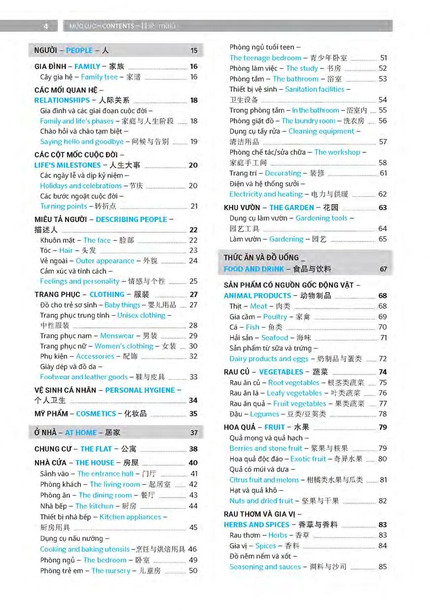 Từ điển được chia theo chủ đề, bao quát hầu hết các phương diện của cuộc sống hằng ngày, từ nhà hàng đến phòng tập thể dục, từ nhà ở đến nơi làm việc, từ thành thị đến cảnh quan thiên nhiên. Bạn cũng sẽ thấy nhiều từ và cụm từ bổ sung để sử dụng trong giao tiếp và để mở rộng vốn từ.