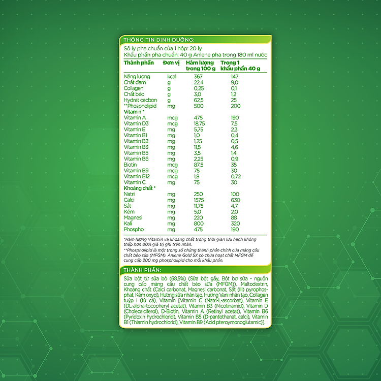 Sữa bột từ sữa bò (68,5%) (Sữa bột gầy, Bột bơ sữa - nguồn cung cấp màng cầu chất béo sữa (MFGM)) Maltodextrin, khoáng chất (Calci carbonat, Magnesi carbonat, Såt (III) pyrophosphat, Kẽm oxyd), Hương sữa nhân tạo, hương Vani nhân tạo, Collagen | tuýp 1 (từ cá), Vitamin [Vitamin C (Natri-L-ascorbat), Vitamin E (DL-alpha-tocopheryl acetat), Vitamin B3 (Nicotinamid), Vitamin D (Cholecalciferol), D-Biotin, Vitamin A (Retinyl acetat), Vitamin B6 (Pyridoxin hydrochlorid), Vitamin B5 (D-pantothenat, calci), Vitamin B1 (Thiamin hydrochlorid), Vitamin B9 (Acid pteroymonoglutamic)].