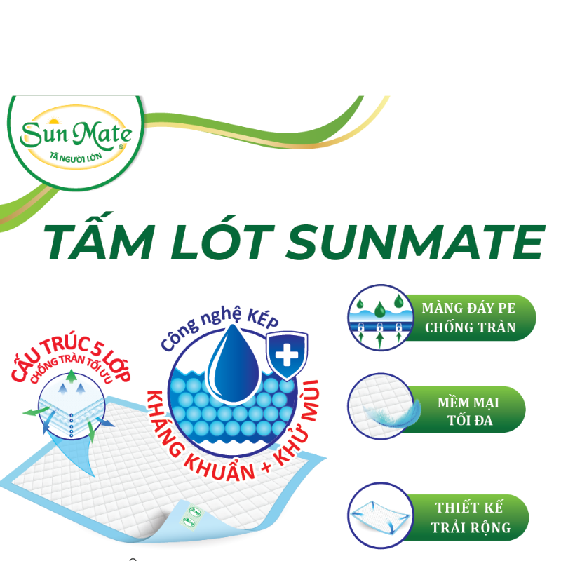 Sản phẩm tấm lót SunMate dành cho cả nam và nữ, phù hợp với người hạn chế khả năng đi lại. Hạt gel tác động kép siêu thấm hút và kháng khuẩn hiệu quả cùng lớp dẫn thấm thông minh thấm hút nhanh, ngăn thấm ngược hiệu quả, giúp luôn khô thoáng, thoải mái cho người sử dụng.