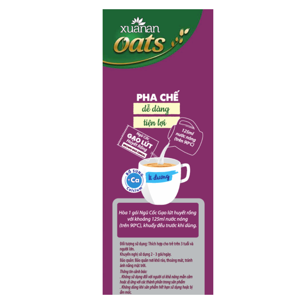 Combo Ngũ Cốc Gạo Lứt Huyết Rồng 400G(25G16 GÓI)+ Ngũ Cốc Dinh Dưỡng Canxi 400G(25G16 GÓI)[ít đường]  Ngũ cốc DINH DƯỠNG CANXI được làm từ rất nhiều loại ngũ cốc bằng công thứ đặc biệt. Sản phẩm được bổ sung Can xi giúp ngăn ngừa loãng xương và sử dụng ít đường. Vitamin, chất xơ và đạm tự nhiên là nguồn dinh dưỡng tốt cho sức khỏe. Thành phần: Ngũ cốc 32% (Yến mạch 10%, bột gạo lứt 5%, bột gạo, bột bắp, bột đậu nành, bột lúa mì, lúa mạch), sữa bột nguyên kem, bột dừa, bột kem thực vật, đường, muối i-ốt, Canxi 0.7%, maltodextrin, chất là dày xanhthan gum (E415), chất chống đông vón (E551), hương liệu tổng hợp dùng cho thực phẩm. 6.75 g đường trong 1 khẩu phần 25g. Ngũ cốc GẠO LỨT HUYẾT RỒNG là thức uống thơm ngon bổ dưỡng, được làm từ gạo lứt, yến mạch và nhiều loại ngũ cốc. Sản phẩm được bổ sung thêm can xi và sử dụng ít đường. Vitamin, khoáng chất, chất xơ tự nhiên giúp hấp thu dinh dưỡng tốt và thanh lọc cơ thể. Thành phần: Ngũ cốc 32% (gạo lứt huyet rong 10%, yến mạch 6%, gạo lứt, gạo nếp cẩm 3%, bắp, đậu nành, lúa mỳ, lúa mạch), bột kem thực vật 29%, đường, đường ăn kiêng Isomalt, sữa tách béo 7%(Instant Skim Milk Powder &%), bột dừa, Canxi 0.7%, Muối I-ốt, maltodextrin, chất maltodextrin làm dày xanthan gum (E415), chất chống đông vón (E551), hương liệu tổng hợp dùng cho thực phẩm. 6.5 g đường trong khẩu phần 25g Đối tượng sử dụng: Trẻ từ 3 tuổi trở lên và người lớn. Đặc biệt là người ăn theo chế độ ăn giảm đường. Hướng dẫn sử dụng: Hòa 1 gói Ngũ cốc với khoảng 125ml nước sôi, khuấy đều trước khi dùng. Dùng 2-3 gói mỗi ngày Bảo quản: Bảo quản nơi khô ráo, thoáng mát; tránh tiếp xúc trực tiếp với không khí và ánh nắng mặt trời. Thông tin cảnh báo: Không dùng khi sản phẩm bị rách, mốc hoặc đã hết hạn sử dụng. Sản phẩm của: Công ty TNHH Thực Phẩm Dinh Dưỡng Xuân An