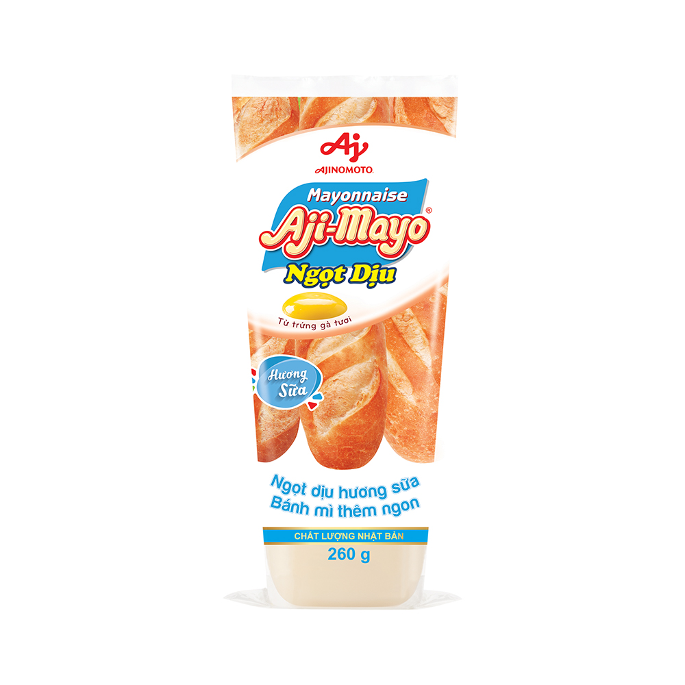 Xốt mayonnaise Aji-mayo vị Dịu 260g được sản xuất từ trứng gà tươi, tại nhà máy Ajinomoto theo công nghệ Nhật Bản, dựa trên khẩu vị người Việt với hương vị phù hợp cho cả trẻ em và người lớn, tạo ra xu hướng mới trong thưởng thức ẩm thực.