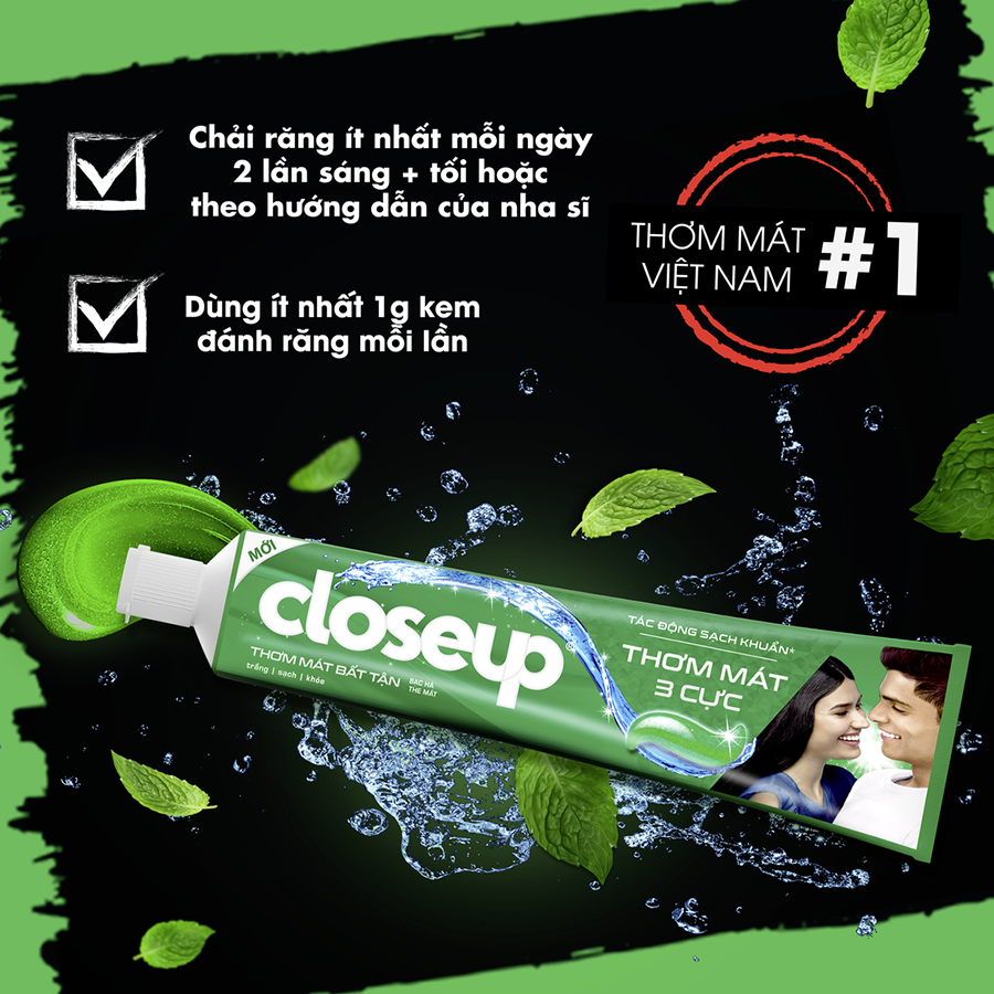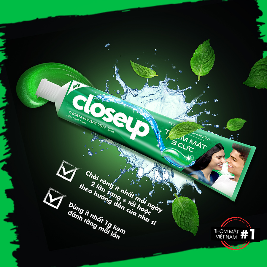 Kem đánh răng dạng gel Closeup Thơm Mát Bất Tận - Bạc Hà The Mát với Công thức Thơm Mát 3 Cực hoàn toàn mới: