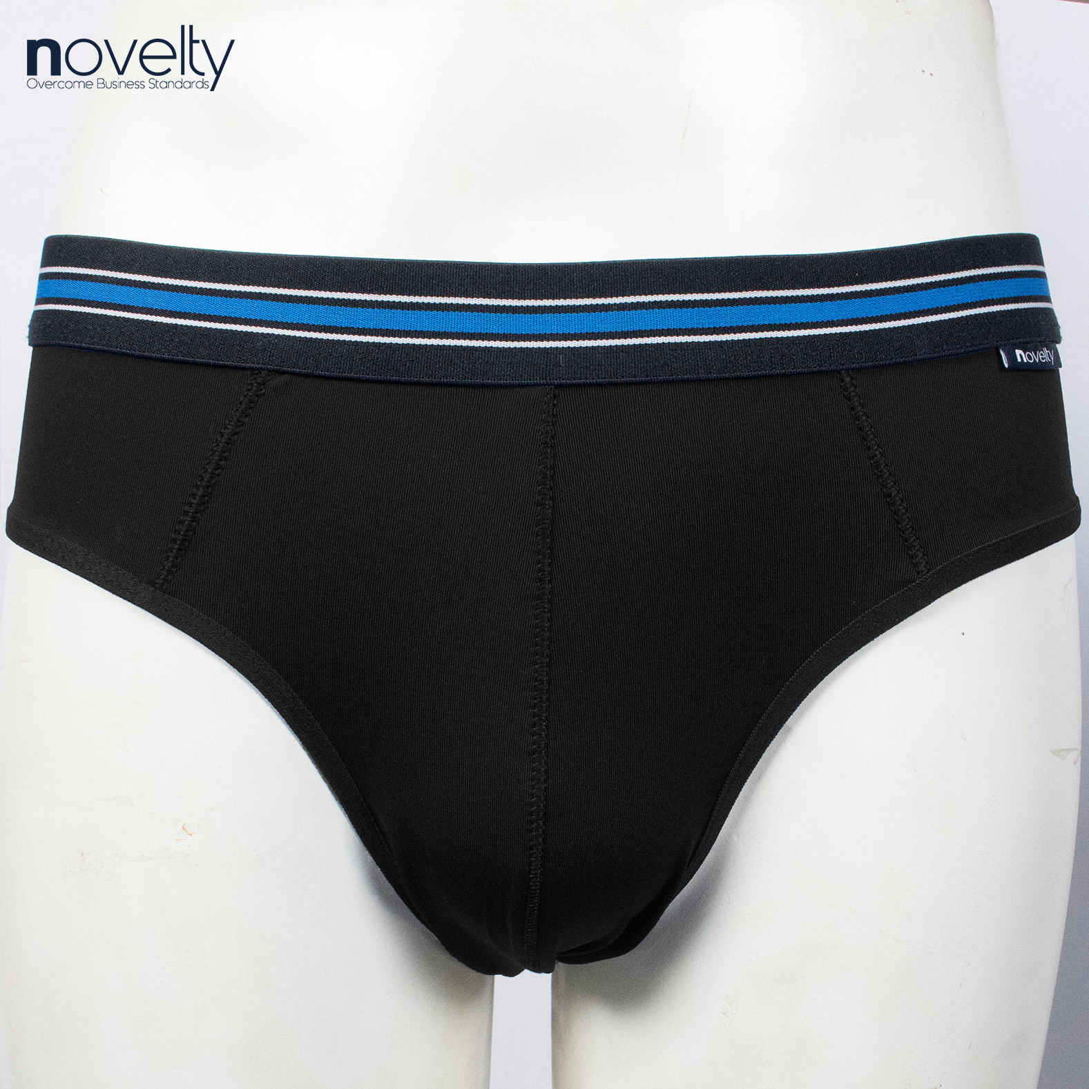 - Bản lưng thun 2.5cm với logo Novelty đính trang trí , được dệt bằng công nghệ mới, đem đến cảm giác co giãn tốt, mềm mượt không vết hằn.