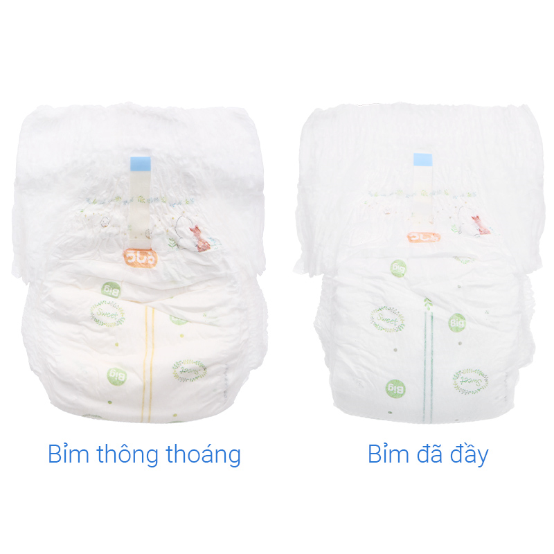 - 3 đường chỉ thị ướt bao gồm 2 bên bẹn giúp mẹ kiểm tra tình trạng tã toàn diện và dễ dàng hơn. Mẹ có thể nhận biết thời điểm thay tã dễ dàng dựa vào vạch màu chỉ thị ướt trên miếng tã. Khi vạch màu tự động chuyển màu, mẹ sẽ biết đã đến thời điểm thay tã. Sợi Nano siêu nhỏ, mịn và lõi bông cao cấp