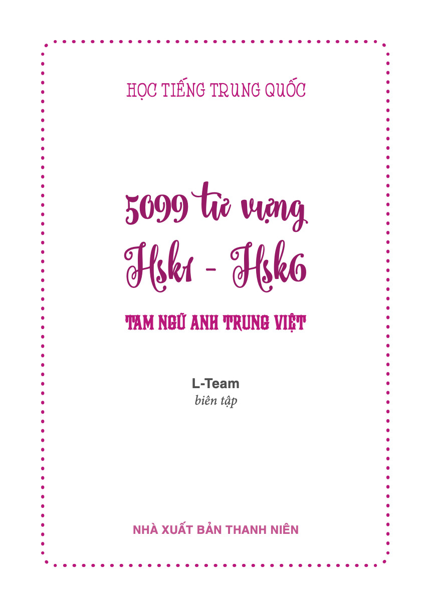 Với nhu cầu học tiếng Trung cũng như thi chứng chỉ HSK ngày càng cao, Lteam đã biên tập nên bộ từ điển tam ngữ Anh - Trung - Việt tổng hợp gồm đầy đủ 5099 từ (từ đơn, từ ghép, thành ngữ) trong chương trình ôn thi HSK nhằm giúp các bạn dễ dàng học, nhớ, hiểu và biết cách dùng, cách viết 5099 từ cực kỳ quan trọng này.