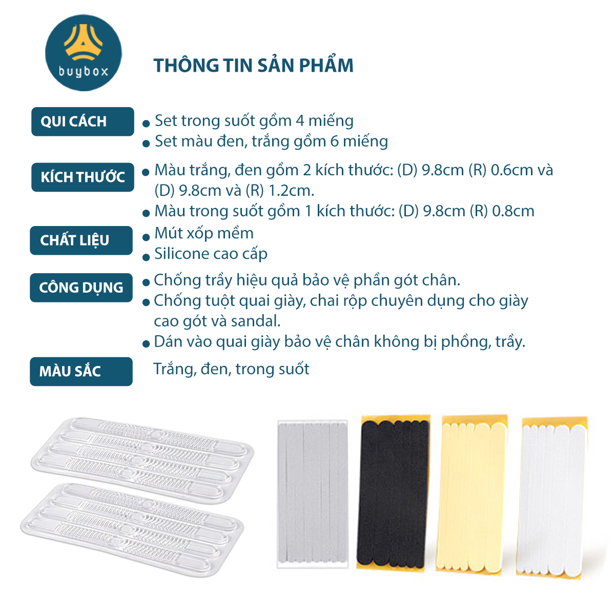 CÔNG DỤNG NỔI BẬC Lót giày đa năng chống rộng buybox là sự kết hợp giữa lót giày và lót chống trầy gót chân. Giúp chống rộng giày, giảm size.
