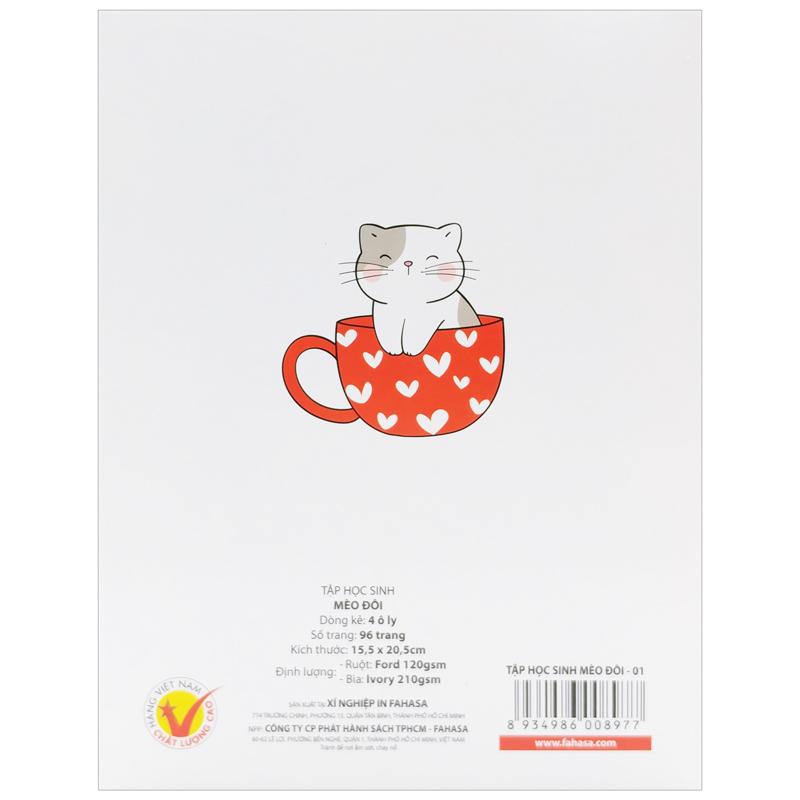 Combo 5 Tập Học Sinh Mèo Đôi - 4 Ô Ly 96 Trang 120gsm - Fahasa 02 (Mẫu Bìa Giao Ngẫu Nhiên) Tập với mặt giấy láng mịn, viết êm tay, tạo nét chữ đẹp.