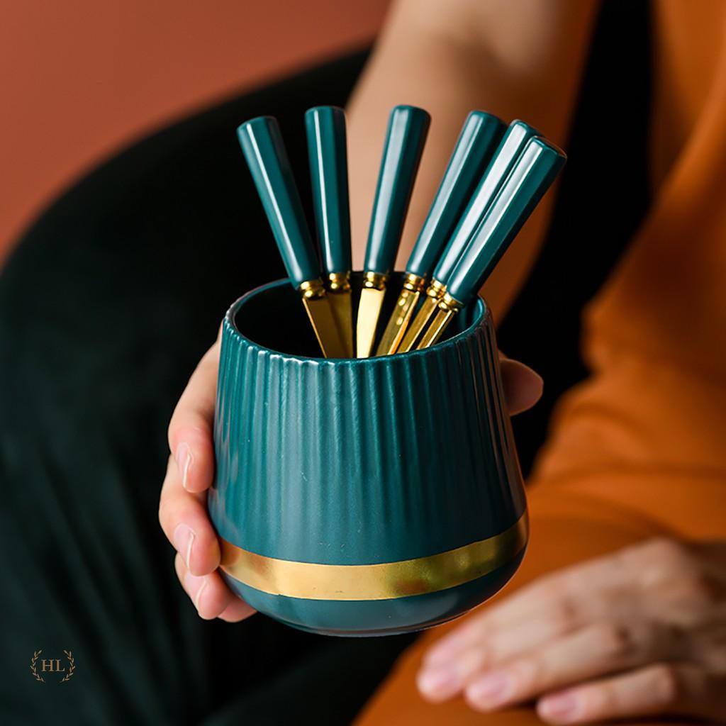 ✨Combo 6 Thìa 6 Nĩa inox hoàng kim cán sứ kèm cốc sứ đựng kẻ vàng kim cao cấp | Hũ sứ xanh trắng kẻ vàng kèm thìa nĩa sứ