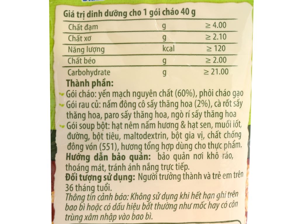 Gói cháo yến mạch nguyên chất (60%), phôi cháo gạo.