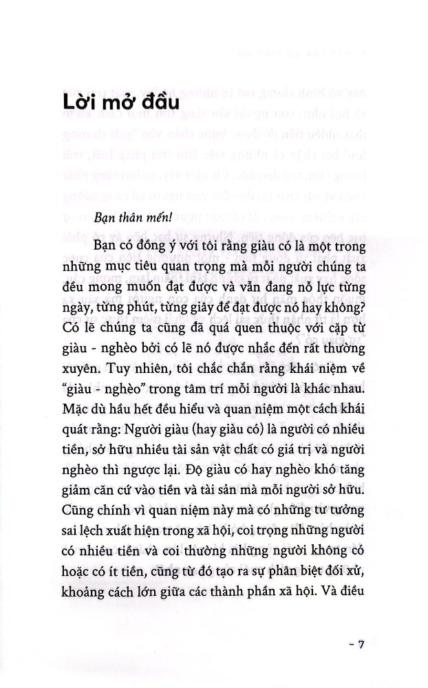 Mặc dù hầu hết đều hiểu và quan niệm một cách khái quát rằng: Người giàu (hay giàu có) là người có nhiều tiền, sở hữu nhiều tài sản vật chất có giá trị và người nghèo thì ngược lại. Độ giàu có hay nghèo khó tăng giảm căn cứ vào tiền và tài sản mà mỗi người sở hữu. Cũng chính vì quan niệm này mà có những tư tưởng sai lệch xuất hiện trong xã hội, coi trọng những người có nhiều tiền và coi thường những người không có hoặc có ít tiền, cũng từ đó tạo ra sự phân biệt đối xử, khoảng cách lớn giữa các thành phần xã hội. Và điều này vô hình chung tạo ra những hệ lụy, mặt trái của xã hội như: con người sẵn sàng tìm mọi cách kiếm thật nhiều tiền để được bước chân vào “giới thượng lưu” bất chấp cả những việc làm trái pháp luật, trái lương tâm, trái đạo đức. Cứ như vậy, xã hội càng phát triển về vật chất thì đạo đức con người lại càng xuống cấp nghiêm trọng, để rồi con người ta lại đổ lỗi cho sự bạc bẽo của đồng tiền. Nhưng sự bạc bẽo ấy có phải xuất phát từ đồng tiền - một phương tiện của cuộc sống hay xuất phát từ chính tâm tham lam, mong cầu, muốn thỏa mãn hư danh của con người mà sâu xa hơn là từ nhận thức sai lệch về khái niệm thực sự của “sự giàu có”?